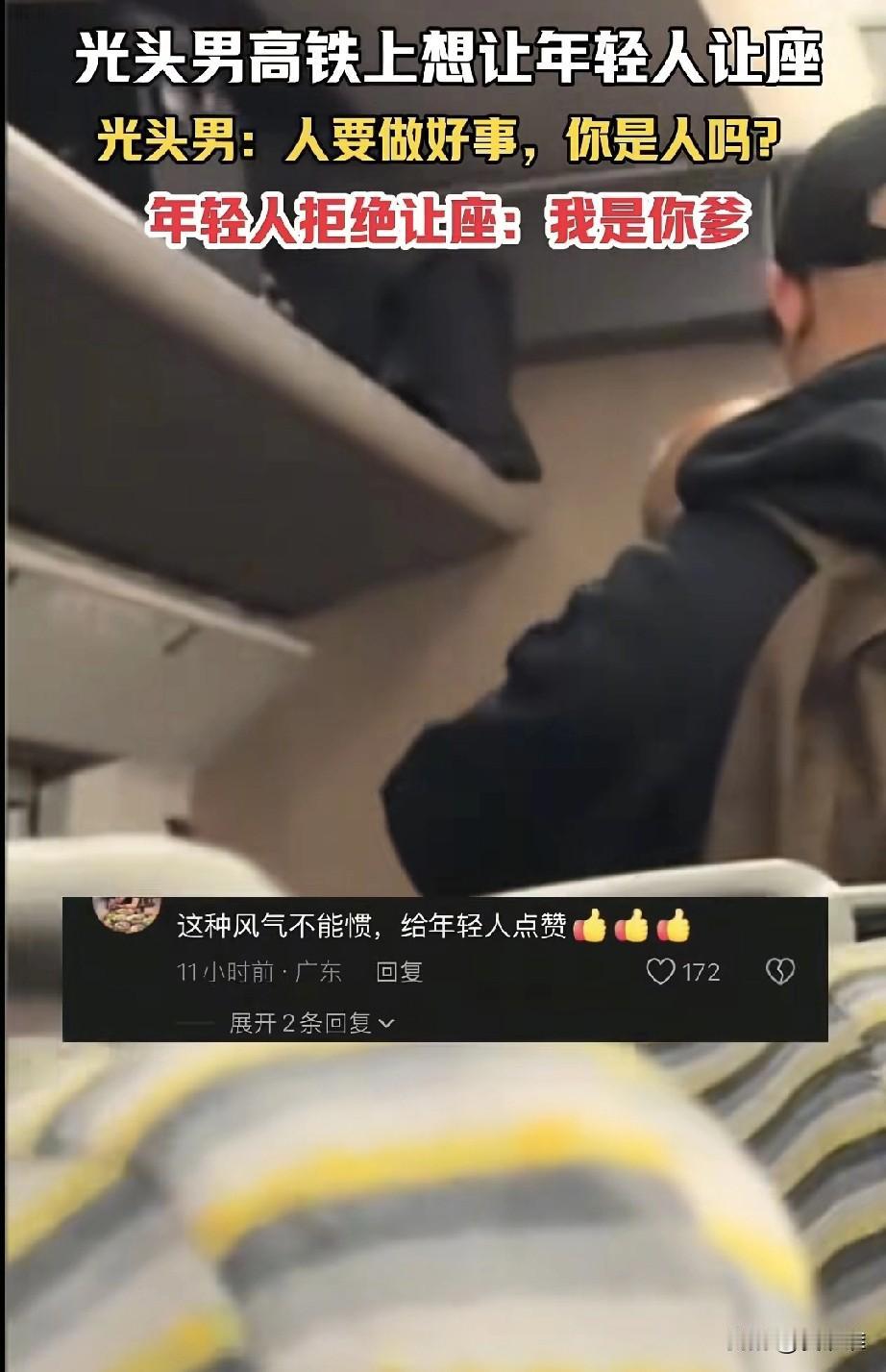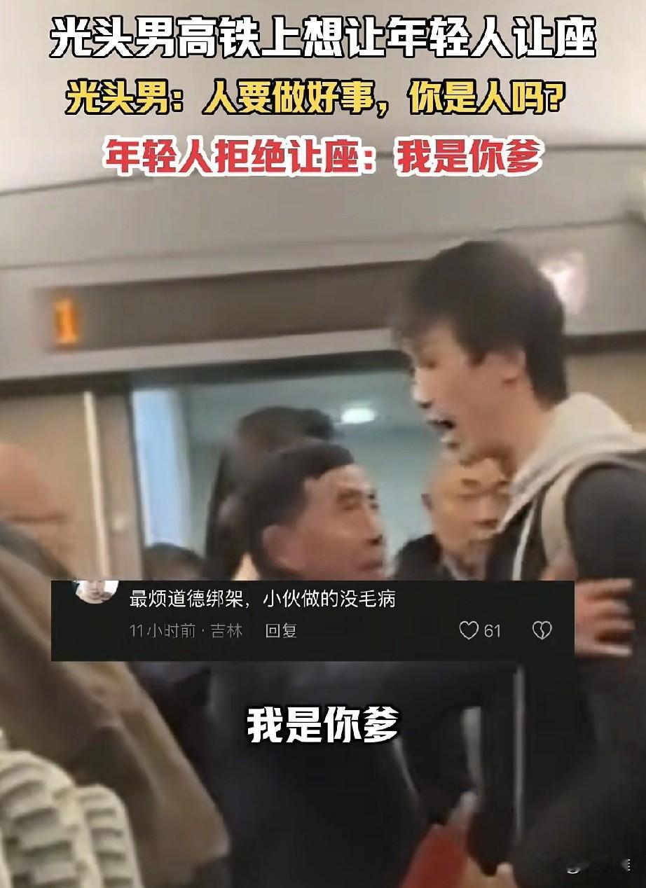 “拒绝道德绑架。”高铁上,一位光头大叔要求年轻小伙让座,被小伙子拒绝后,没想到大叔破口大骂:“是人都应该做好事,你是人吗?畜牲。”小伙子完全不示弱,立马回怼道:“我是你爹,滚开!”两人互相骂了几分钟后,列车员出面调解,他们表示:列车上经常遇到这种情况,如果调解不成,只能报警处理。 虽然我也是老年人,但我支持这个年轻小伙,有的人越老越没素质,他竟然还说叫警察过来,警察会帮你无理取闹吗?