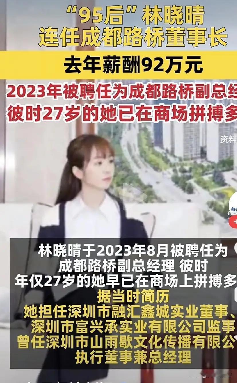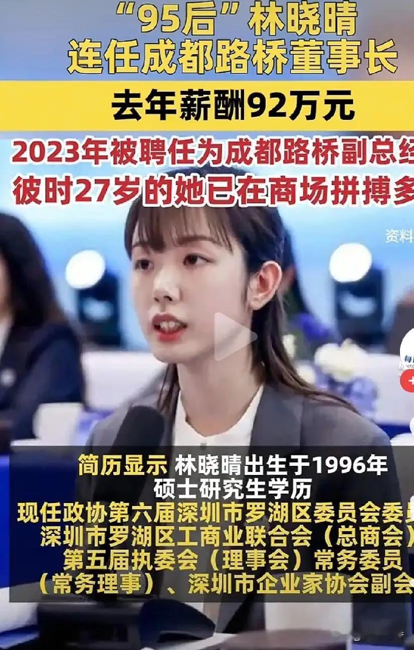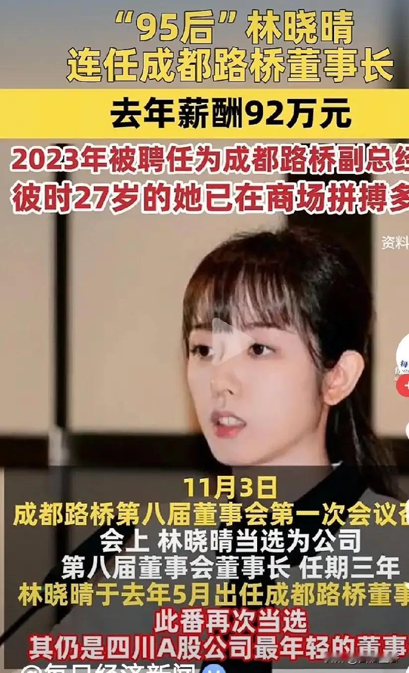 她又当选董事长了!“95后”林晓晴连任成都路桥董事长的新闻冲上了热搜,引起了大家的关注! 她又当选董事长了!“95后”林晓晴连任成都路桥董事长的新闻,瞬间冲上了热搜榜单,成为社会热议的焦点。这不仅仅是一则关于年轻人的成功故事,更像是一面镜子,折射出当代社会对“年轻力量”的重新定义和期待。 在许多人的传统认知里,企业高层的宝座似乎总是由“经验丰富”的老将把持,年轻人要登上这个位置,似乎还遥不可及。然而,林晓晴用实际行动打破了偏见。她出生于1996年,刚刚步入而立之年,却已经连续两次当选企业的“掌门人”。这背后,隐藏着什么样的秘密?她究竟凭借什么,赢得了行业和社会的认可? 硕士研究生的学术背景,或许只是她成功的起点。更重要的是,她那份对行业的敏锐洞察力和敢于创新的勇气。在她的带领下,成都路桥不断探索新技术、新模式,企业的业绩稳步提升,甚至在行业内树立了标杆。她的成功告诉我们:年轻并不意味着没有能力,反而意味着拥有无限的可能。 这也引发了更深层次的思考:我们是否在潜移默化中低估了年轻一代的潜力?是不是该给年轻人更多的舞台,让他们用新思维、新技术推动行业变革?林晓晴的故事,无疑为许多年轻人树立了榜样,也为整个社会敲响了警钟——未来的领袖,可能就藏在我们身边的年轻一代中。 当然,也有人担心“年轻领袖是否成熟稳重”,有人质疑“年轻是否能承担起如此重任”。但事实证明,能力和责任感,从不以年龄为界。她用行动证明:只要有梦想,有担当,年轻就可以成为改变的力量。 这不仅仅是一个个人的成功,更是一场关于未来的宣言。年轻不是借口,而是力量;创新不是空话,而是行动。林晓晴的故事激励着无数年轻人:只要敢于追梦,未来就属于你们。 你怎么看?是不是也被她的故事点燃了心中的那份激情?留言告诉我你的看法,让我们一起讨论这个属于新时代的精彩篇章! 她又当上了董事长