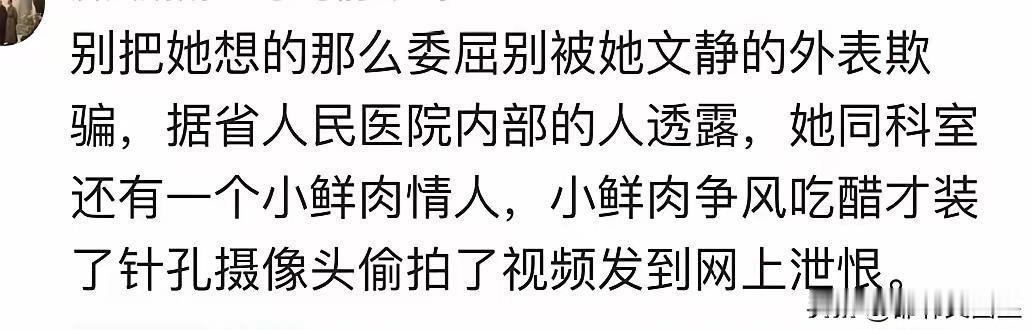 不是xx而是争风吃醋? 湖南副院长和眼科副主任的不雅之事被网上曝光后,有人猜测可能存在权色交易,猜测眼科副主任可能想以此讨好副院长谋更高职位。 但是,有知情网友爆料称,因为眼科女医生在医院还有一个小鲜肉情人,因为眼科医生与副院长的事,小鲜肉争风吃醋,就偷偷安装了针孔摄像头拍视频发网上泄愤。 当然了这只是私下流传的信息,真实性有待考证,我们还是以官方通报为准。 不过,副院长与眼科女医生的行为,实在令人作呕。 两个人应该都是有家室之人,又都是医院的骨干人才,专家,教授,不是专心致志为患者治病,却在办公室偷偷干些见不得人的事,虽然两个人是你情我愿,但是也应该受到应有的处罚和道德的谴责。副院长疑出轨眼科副主任 均被停职