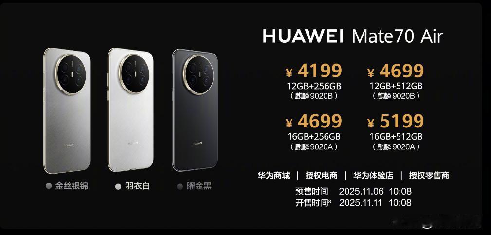 重新定义Air?华为Mate70Air发布,4199起! 先看价格: 12+256GB:4199元 ; 12+512GB:4699元 16+256GB:4699元 ; 16+512GB:5199元 再说配置: 7英寸2760*1320p 1.5K+120Hz大屏,18.8:9,前置10.7Mp; 处理器上:12GB版本麒麟9020B,16GB版本麒麟9020A; 后置50Mp 1/1.3"超大底主摄+8Mp超广角+12Mp RYYB 3X长焦+1.5Mp红枫多光谱镜头; 支持双向北斗短信+WIFI7+,侧边指纹解锁。 6500mAh+66W,USB 2.0,IP68/IP69,6.6mm/208g 对了,这部Air是没有eSIM的,再加7英寸大屏和6.6mm的机身厚度(要不然也做不出6500毫安的大电池),确实有点刷新我们对Air的固有印象,我倒是觉得叫Mate70Plus更合适!