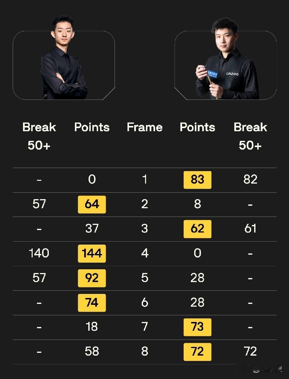 国锦赛首场半决赛第一阶段,赵心童4-4战平吴宜泽。第二阶段19点30分开始。 第一阶段双方都有一些失误,分差没拉开,前4局2-2,其中第4局,吴宜泽打出单杆140。之后吴宜泽连赢两局,4-2领先。第7局,赵心童追了一局,3-4落后。第8局,吴宜泽率先拿到58分,结果出现防守失误,被赵心童72-58逆转。第一阶段双方4-4战平。 总的看,由于双方都有一些失误,比赛不算太精彩。第二阶段19点30分开始,谁能进决赛还不好说。