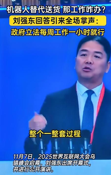 震惊了 11月7日,刘强东在世界互联网大会开幕式上的演讲,惊呆了所有人。 刘强东讲: 机器人替代人力已成趋势,京东物流已实现从仓储到配送,全流程无人一体自动化,如无人配送车、智能门锁联动等高科技。 于是有人提问刘强东,机器人替代送货,那工作怎么办? 没想到刘强东的回答震惊所有人,他讲只要我们政府立法,每周我们只需要工作一天,甚至一天只需要工作一个小时就可以。 人可以学习机器人维修,维护保养,自主写代码改装机器人提供个性化服务。人可以服务机器人,这就是工作。 不是工作多少时间的问题,是工资发多少,以前一天工作8小时月发8000,现在一天工作1小时月发一千,一个月够花吗? 加班,是为了多赚钱,结果导致更多的人失业。华为员工也天天加班,但是他们搞出来的高科技,会极大的提高生产效率,最终会减少无数的工作岗位。你看,尊界的生产线,那么大,才用几个人?所以刘强东说的没错,那是唯一出路。