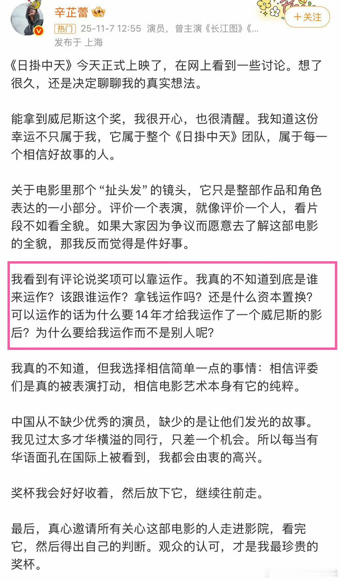 陈砺志在朋友圈力挺辛芷蕾,他说 :不认识辛芷蕾,就想转发一下,特别框出了她的连环问。中国电影其实在国际上没有强大到可以撕奖,运作奖的地位和影响力。