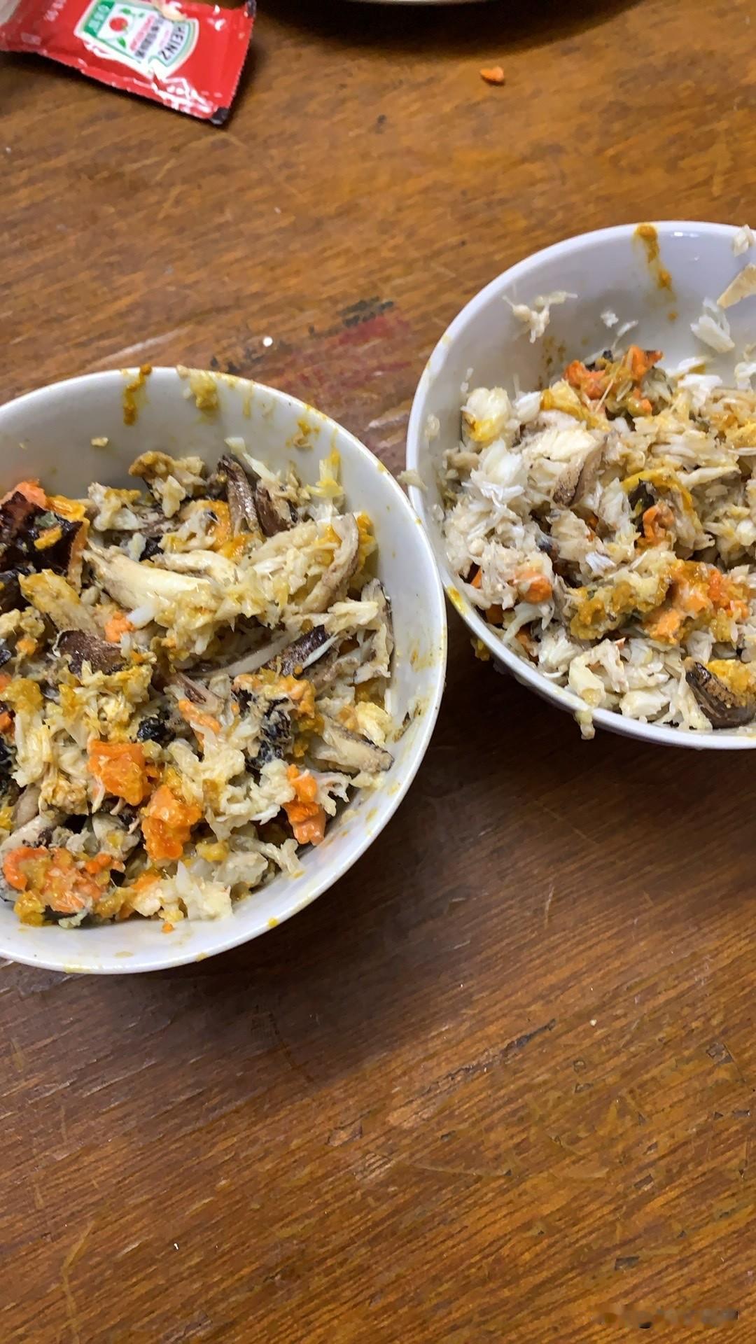 前两天有亲戚从苏北寄来一些螃蟹,吃了一半,还有一半今天把它出成蟹粉,放在速冻里过几天可以做个蟹粉蹄筋,再来一个蟹粉豆腐,这个就是我一个上午的成果,看看多诱人。