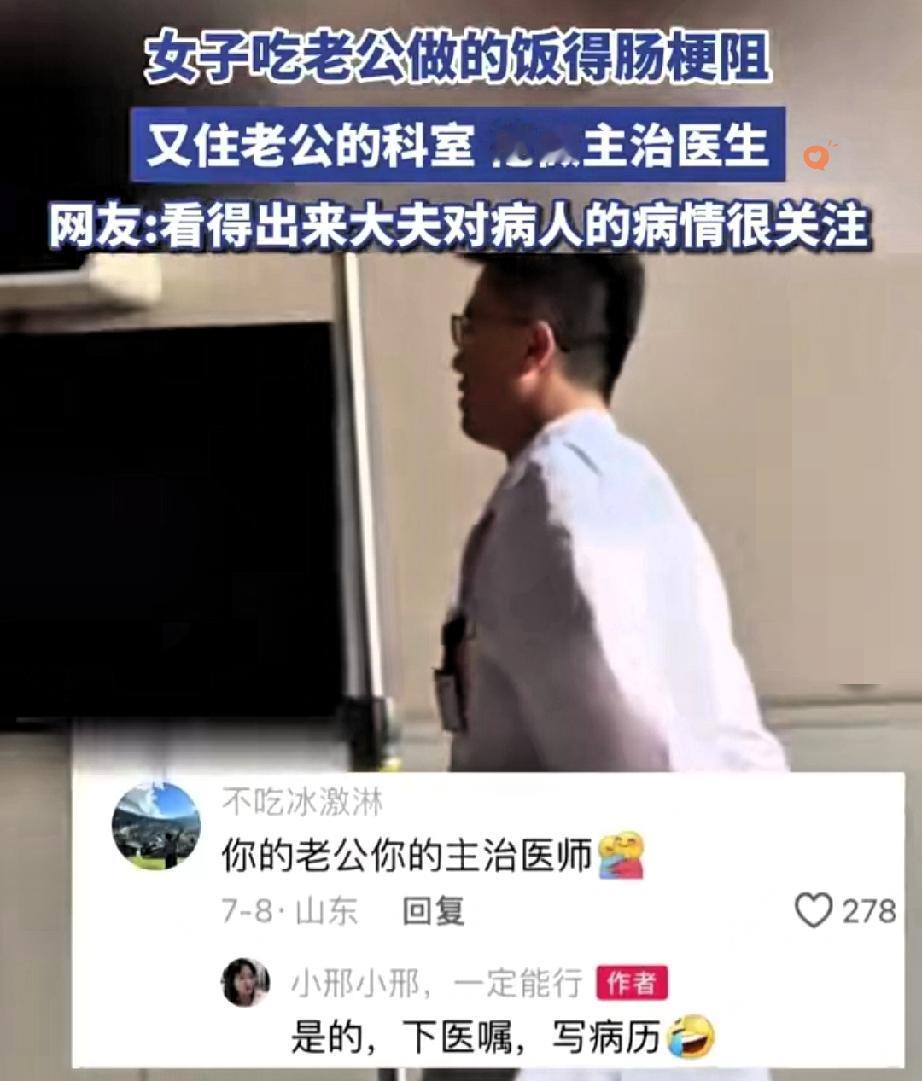 谁能想到一顿爱心晚餐能把自己送进医院,还撞上老公当主治医生! 山东王女士这波经历简直比电视剧还离谱。 下班回家就赶上丈夫老陈精心准备的大餐,烧鹅配炒菜香到上头,饿坏了的她狼吞虎咽全炫完,结果半夜就被肠梗阻疼到蜷缩。 本以为是普通吃撑,没想到得住院,更绝的是推开门的主治医师竟是自家老公。 王女士当场脑补出“被老公当临床案例”的大戏,网友更是笑疯:“拉业绩也不用拿媳妇开刀啊”“这是沉浸式体验医患关系?” 其实就是烧鹅太油+吃得太快闹的,跟厨艺没啥关系。 但不得不说,这波“强制陪伴”也挺甜,老公又做饭又治病,就是方式太奇葩。 婚姻里的趣事往往藏在这些意外里,看似离谱却满是烟火气。 你家有没有过这种又好气又好笑的夫妻名场面?来评论区分享下~