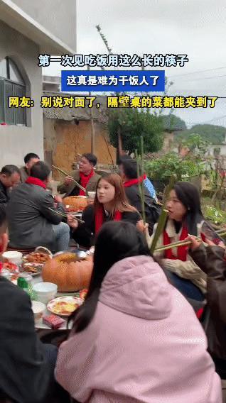 刷到这个视频我直接愣住:这到底是啥风俗啊?头回见吃饭用这么长的“筷子”! 视频里一桌子人举着快赶上竹竿的超长“筷子”,菜就在眼前,胳膊伸直了才勉强够到,夹菜跟“远程投喂”似的——有人刚夹起块肉,手一抖直接掉地上了,还有人“筷子”都快戳到隔壁桌了,这饭吃的,到底是啥讲究啊? 有知道的友友吗?筷子礼仪 餐具习俗