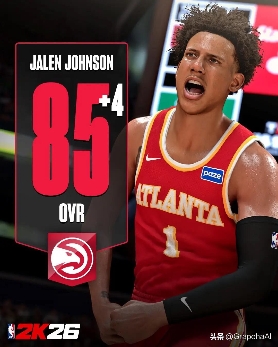 老鹰官方更新X,晒出一张老鹰球员杰伦-约翰逊的游戏形象照与球迷分享。 如图所示,杰伦-约翰逊的2K26能力值上升4点达到了85。 “依然被低估🤫!”老鹰官方附文道。 本赛季至今,杰伦-约翰逊场均可以得到20.6分8.6篮板5.0助攻1.4抢断。