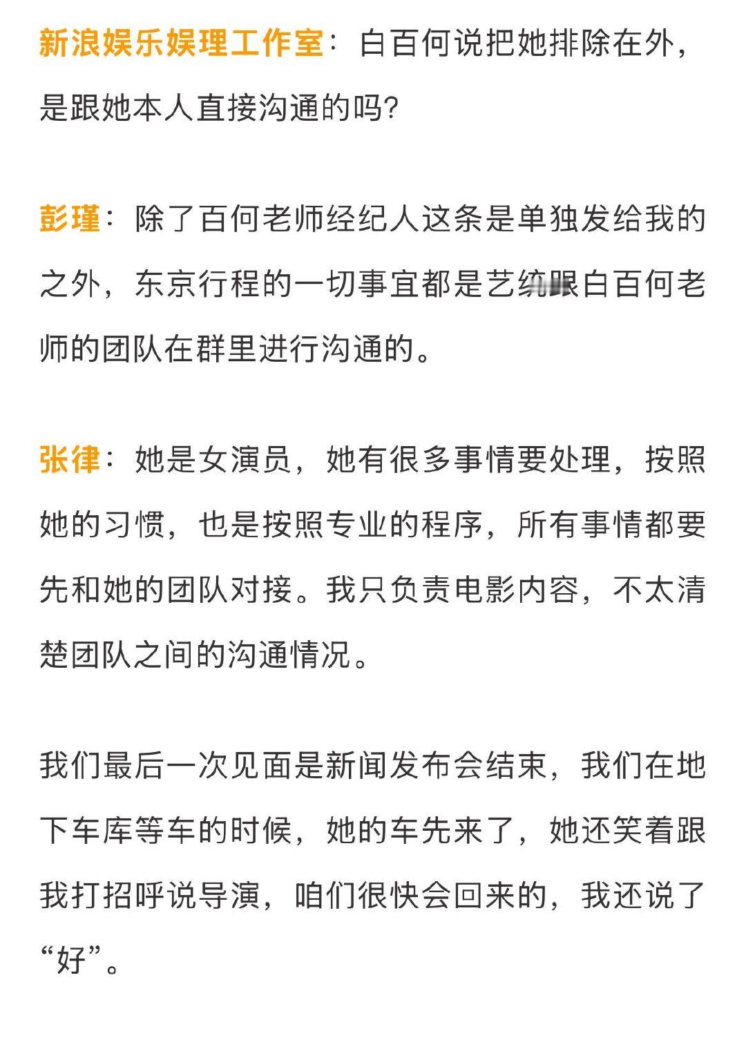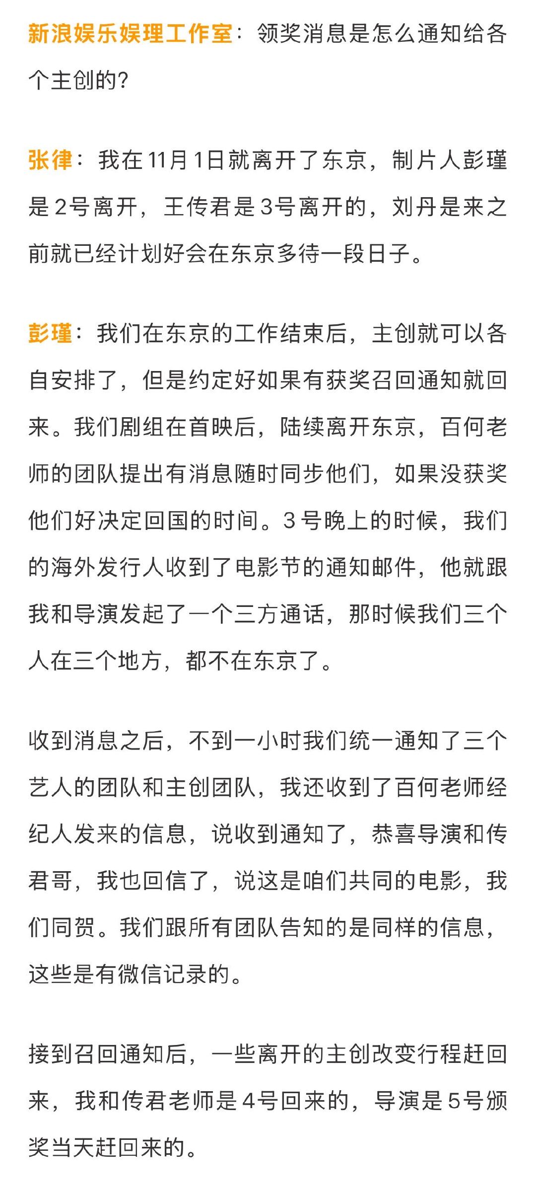 春树导演制片人回应争议 张律否认靠卖惨打动白百何 据导演张律、制片人彭瑾向新浪娱乐透露,《春树》剧组主创从11月1号开始陆续离开东京,“我们在东京的工作结束后,主创就可以各自安排了,但是约定好如果有获奖召回通知就回来。3号晚上,我们的海外发行人收到了电影节的通知邮件。不到一小时我们统一通知了三个艺人的团队和主创团队,我还收到了百何老师经纪人发来的信息,说收到通知了,恭喜导演和传君哥,我也回信了,说这是咱们共同的电影,我们同贺。”娱理独家↓