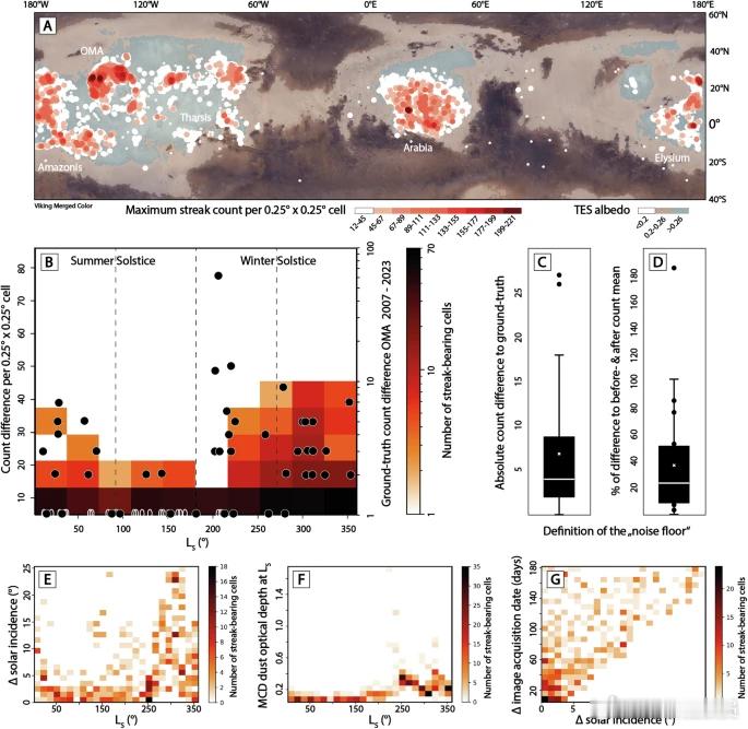 结果发现,条纹的形成速率在火星不同区域和不同时间存在显著差异,平均每条现有条纹每火星年约产生0.05条新条纹。在所有年度形成的条纹中,仅约0.1%可直接归因于陨石撞击和火星地震等非季节性过程。绝大部分条纹的形成与大气尘埃的季节性输送密切相关,并在南半球的夏季和秋季达到高峰。这一时期,风应力系统性地超过引发沙粒跃移和尘埃移动的临界阈值。