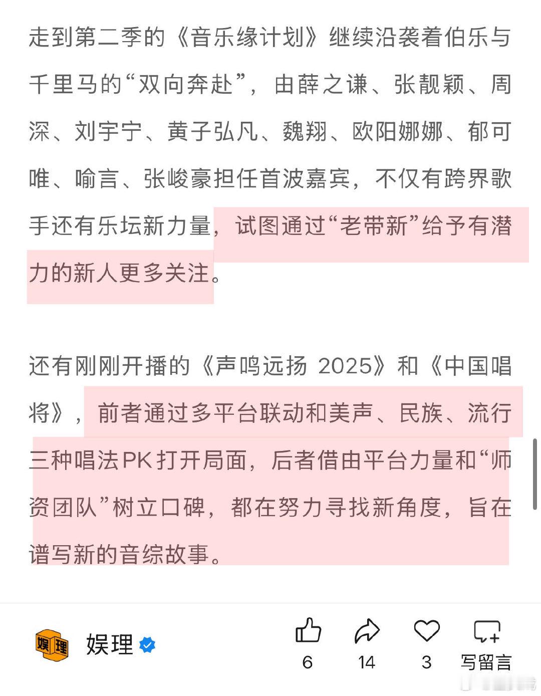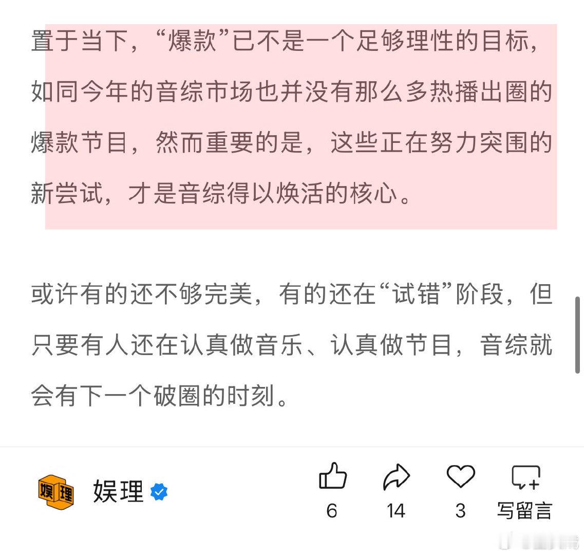 今年的音综会有出圈爆款吗 某爆款音综歌手被音乐节婉拒 在看来,就当下的音综市场而言,“爆款”已不是足够理性的目标,如同今年的音综市场并没有那么多热播出圈的爆款节目,然而重要的是,这些正在努力突围的新尝试,才是音综得以焕活的核心。或许有的还不够完美,有的还在“试错”阶段,但只要有人还在认真做音乐、认真做节目,音综就会有下一个破圈的时刻。娱理独家↓