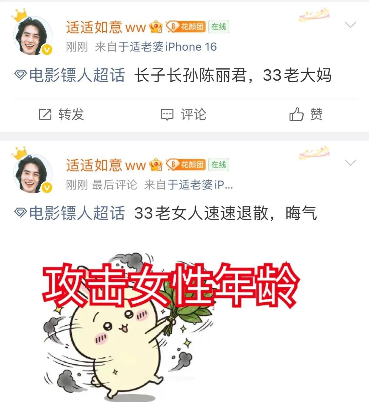 一早起来,发现于适和陈丽君粉丝撕得越来越厉害了! 事情起源于电影《镖人》上电影推介会,上面的排名顺序是吴京、谢霆锋、李连杰、陈丽君、于适(图一)…… 然后这下惹了马蜂窝。要知道在杀青时,官方的排位李连杰之后可是于适(图二)! 于适粉丝直接点名“越剧女”,说陈丽君买了营销号……而更猛的是,竟然有于适粉丝对陈丽君年龄发起了攻击,说她“长子长孙,33岁陈丽君”,“33岁老女人,速退,晦气”等! 说实话,我是无法理解这种“抢排位”的行为的。 第一,排在前面,就说明咖位大?就说名气大?就说明演技好?好不好,在观众看后的感受吧?你看李连杰排第三,他说了什么吗? 第二,每个人的咖位都是慢慢长大的。你今天排第五,自己努力,过几年排第三,何必去争呢?你真有本事,别人自然会给你排前面。你看吴京排第一,有人提出了意见吗?没有啊!因为无可撼动。如果有争议,说明实力不够!#陈丽君#