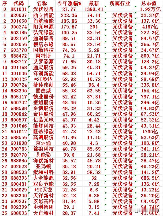 光伏设备概念,2025年以来涨幅最多的35名单 酉立智能:今年涨幅 +222.36%,总市值 32.37亿元 首航新能:今年涨幅 +185.86%,总市值 137.6亿元 阳光电源:今年涨幅 +179.87%,总市值 4167亿元 弘元绿能:今年涨幅 +100.25%,总市值 222.3亿元 通润装备:今年涨幅 +89.51%,总市值 84.67亿元 横店东磁:今年涨幅 +85.67%,总市值 366.7亿元 国晟科技:今年涨幅 +74.26%,总市值 34.67亿元 阿特斯:今年涨幅 +74.10%,总市值 800.7亿元 艾罗能源:今年涨幅 +71.65%,总市值 128.3亿元 通灵股份:今年涨幅 +69.26%,总市值 54.37亿元