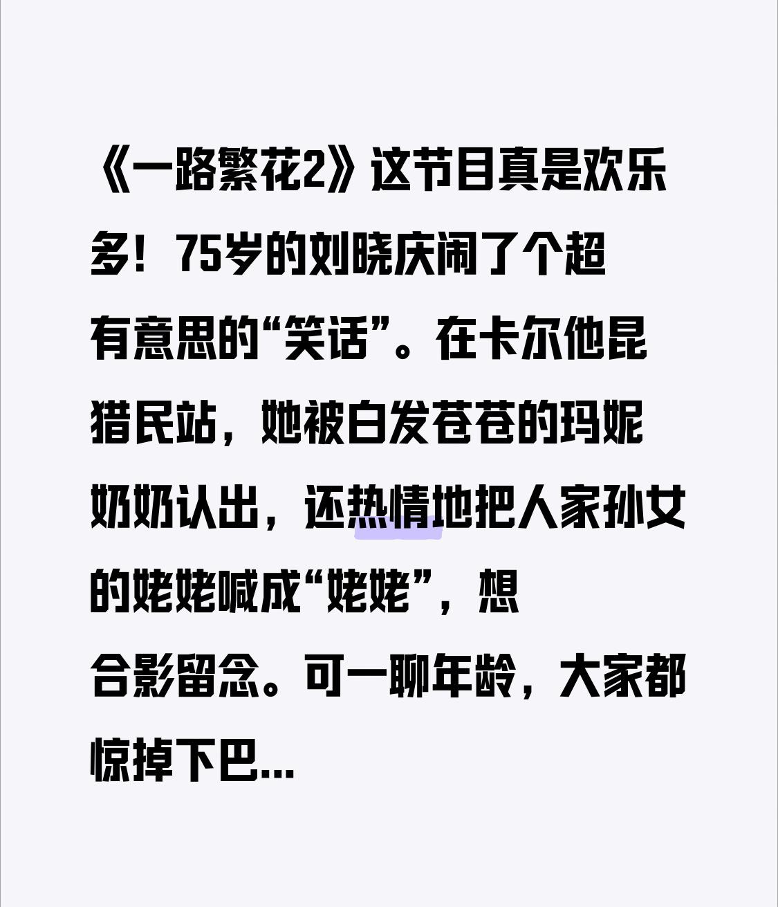 《一路繁花2》这节目真是欢乐多!75岁的刘晓庆闹了个超有意思的“笑话”。在卡尔他昆猎民站,她被白发苍苍的玛妮奶奶认出,还热情地把人家孙女的姥姥喊成“姥姥”,想合影留念。可一聊年龄,大家都惊掉下巴,这位“姥姥”居然才74岁,比刘晓庆小一岁。 不得不说,刘晓庆状态是真的好。她作为节目里唯一的返场嘉宾,能吃能喝能跑能跳,跟年轻人也没代沟,和小一轮多的刘嘉玲同框也不显老。这次喊“姥姥”的小插曲,也侧面说明她看着实在年轻,才会错估别人年龄。
