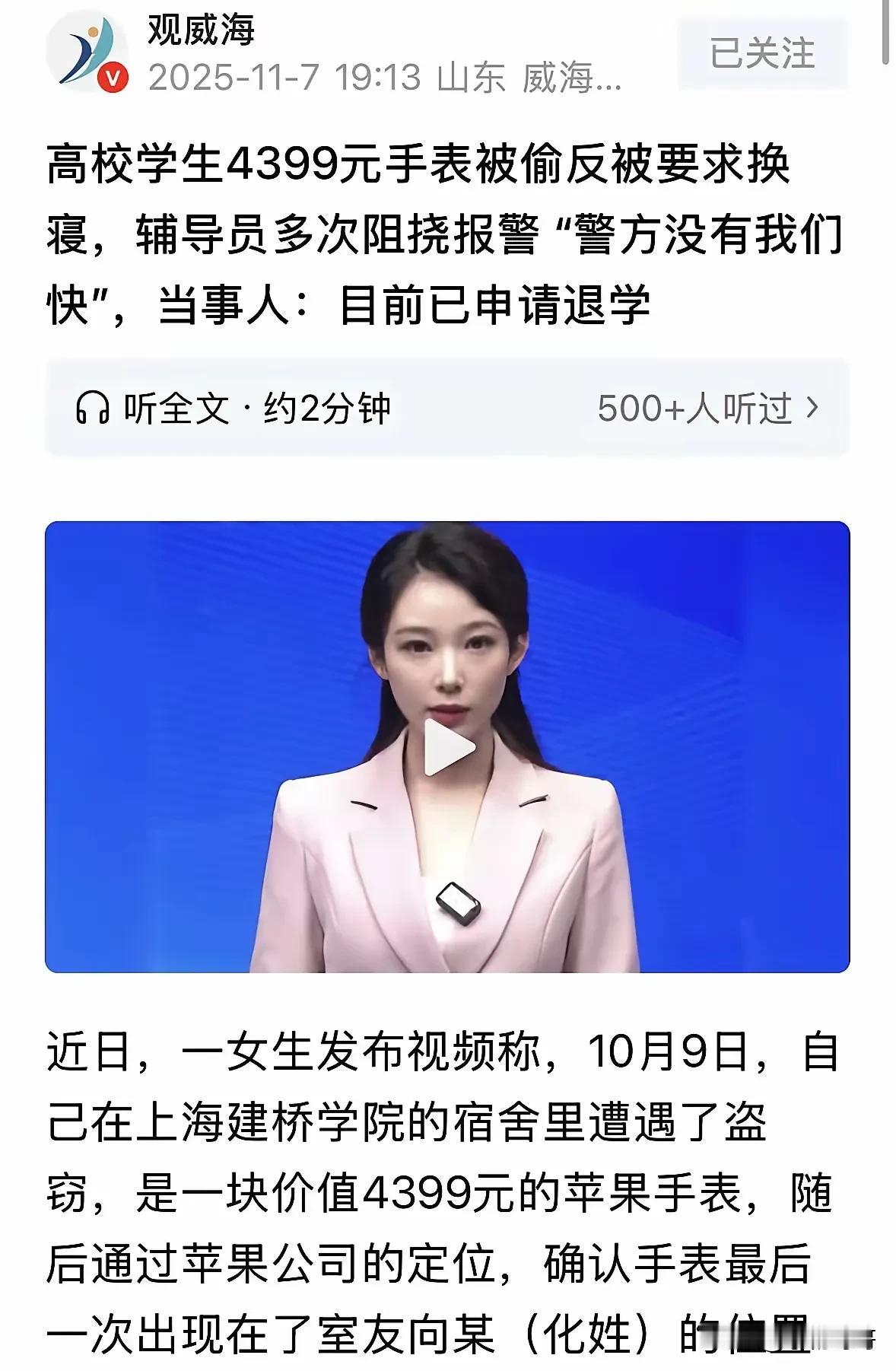 19岁的林晓薇给所有学生提了个醒 不是因为手表丢了,也不是因为退学,而是当你按规则维权时,有些人第一反应是解决提出问题的人。 她发现价值4399元的手表在宿舍失踪,苹果定位指向室友向某。辅导员阻挠报警,声称警方不如学校处理快,甚至要求其他室友搬离、断电施压。林晓薇退学时,手表没找回,反被学校扣了5330.6元,而她仅正常上课4天。 这事最寒心的不是损失财物,而是维权通道被堵。辅导员明知向某有盗窃前科,却选择掩盖真相;学校扣费时毫不手软,回应投诉时只剩一句依法处理。如果连学校都教人忍气吞声,规则就成了空话。 关注@草根微评,看冷暖现实 校园维权