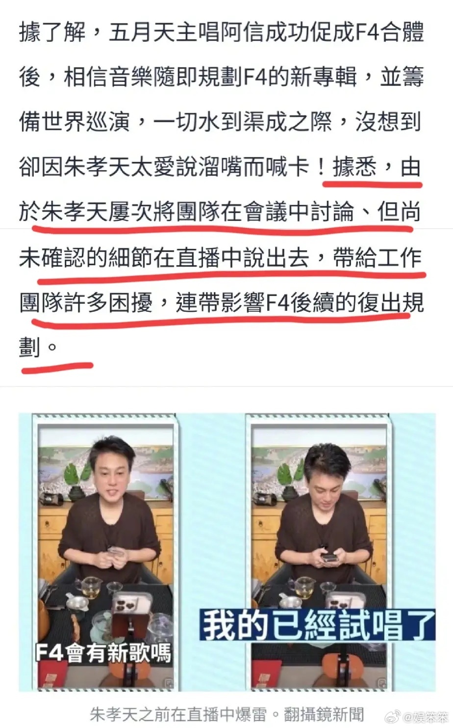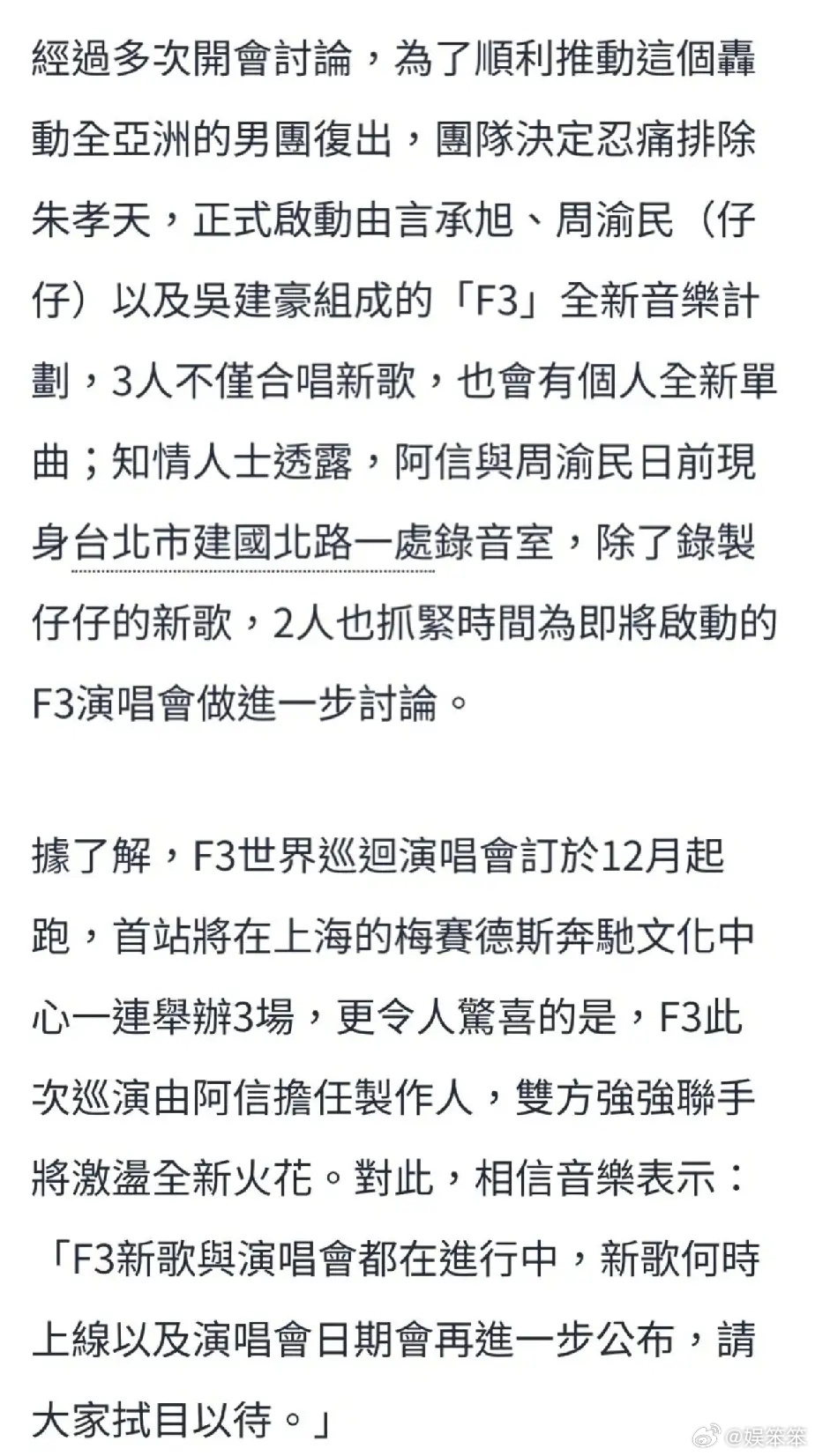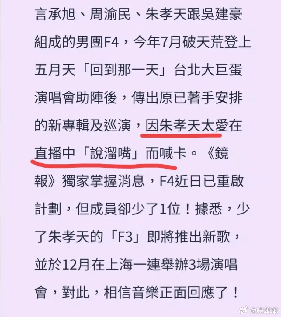 网传F4要开演唱会了,但是参加人员只有言承旭,周渝民和吴建豪三位,唯独缺了朱孝天。