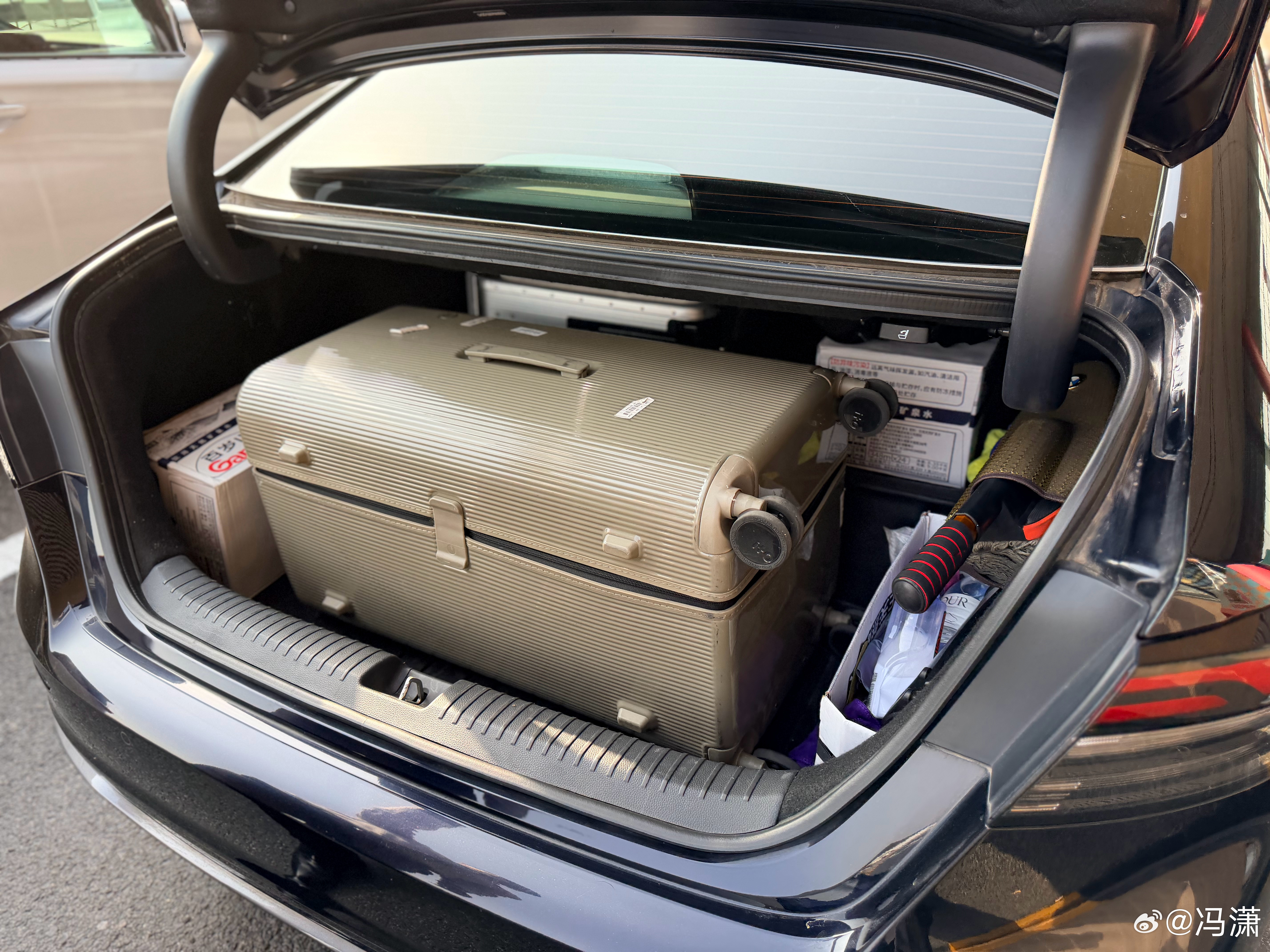 本田雅阁PHEV这个后备箱虽然只算容积也不小,但不平整多少还是影响放东西,尤其是里面高很多把东西放进去要探着上身把东西抬起来再送进去,这姿势对腰可很不友好,一不留神就闪了,我曾经很多次拿备胎都差不多这姿势闪的腰,就比如这个电动箱子贼沉放进去就挺难受,好在俩箱子都放进去了就是手提的东西只能放副驾驶座位了