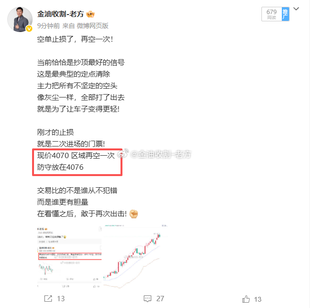 黄金4070布局二次空,10分钟不到虽然挽回了30点利润,但空头形势依旧严峻,市场烟雾弹太多,消息面层出不穷,稳健的朋友可以先撤离,行情的每一波来回,都是对心理承受力的一种考验[作揖]黄金金价金油趋势实战大师-老方