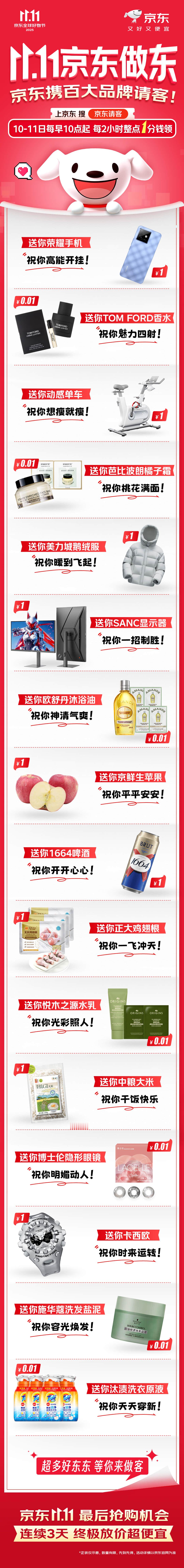 朋友圈是不是都在传,今年双11被京东包场了?看了一圈,好家伙,做东请客的清单豪到有点离谱,连鸭鸭羽绒服这种硬通货都直接送。双11京东做东,京东请客,你做客,送的都是好东东!11月10-11日,京东携上百家品牌接龙请客,每天10点起,每2小时整点低至1分钱领大牌惊喜!真正的11.11从11月9日晚8点开始!京东11.11 连续3天 终极放价更便宜!2351元补贴,人人可领!京东双11请客送手机羽绒服化妆品双11京东做东携百大品牌请客京东11.11 又好又便宜