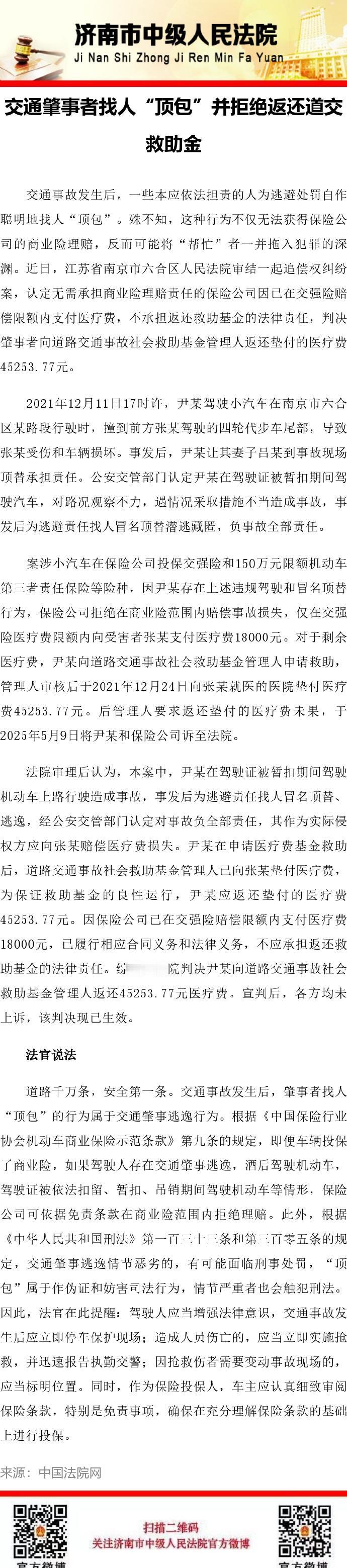 【交通肇事者找人“顶包”并拒绝返还道交救助金】 法姐讲法