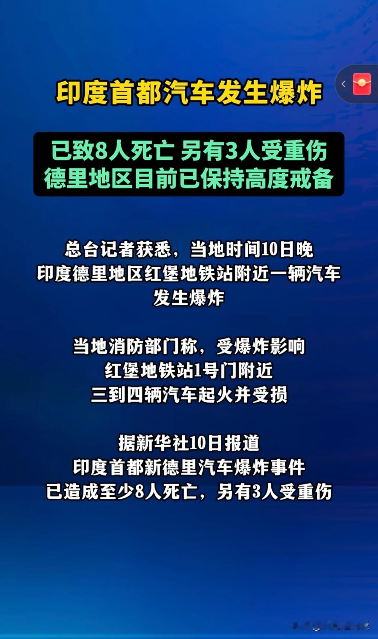 印度德里发生汽车爆炸! 拒印度媒体报道,当地时间昨晚6点52分,德里红堡地铁站旁发生了一起汽车爆炸,目击者称现场一片火海,数辆汽车被焚毁,造成10多人死亡,20多人受伤。 据目击者称,爆炸发生后,现场一片狼藉,至少六辆汽车被烧毁,包括一辆停靠在路边的消防车,三辆三轮车被焚烧殆尽。多名路过的行人和司机被烧伤,其中一些人伤势严重。 目击者称,当时正在附近的几名警察赶到现场时,大声呼救的人很多,他们立即用灭火器对几名烧伤的人进行紧急救助,叫来救护车,将伤者送往医院。 目击者称,爆炸声很大,“我们以为是地震,随后就看到浓烟四起。” 当地居民称,红堡地铁站附近很繁华,有很多商铺,很少有车辆停靠在路边,因为那里不允许停车。“这是我们没有想到的,谁会想到在这么繁华的地方发生爆炸。” 美国驻印度德里使馆也发布了安全警报,提醒在德里的美国公民避免前往红堡及周边地区。德里也回忆起曾经的恐怖袭击,难道这次又是故意的吗?大家对此有什么看法?欢迎评论区留言!