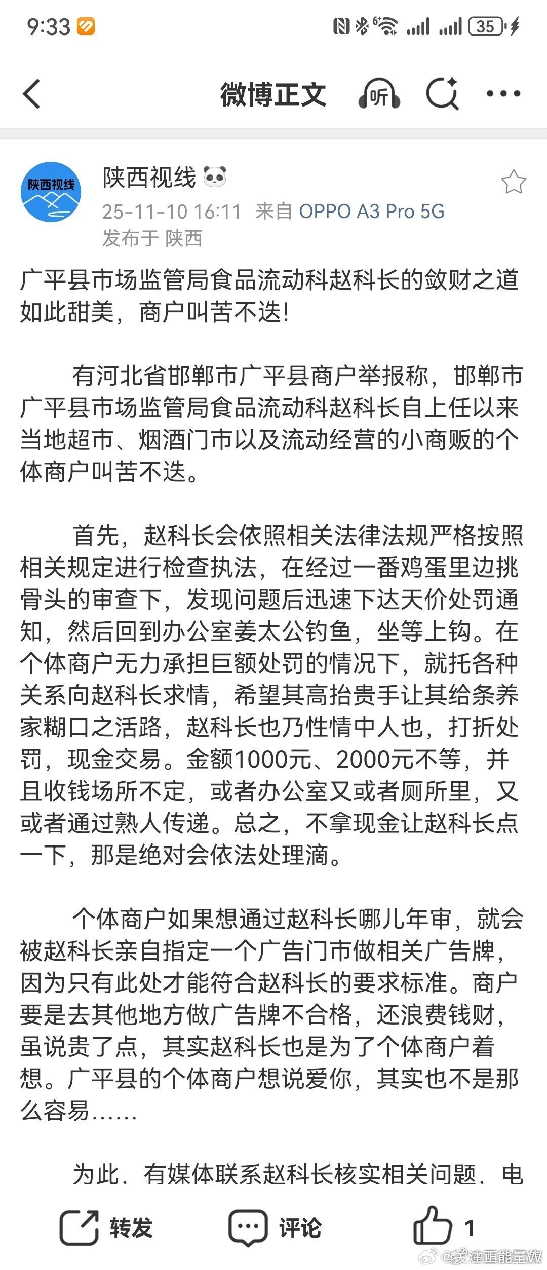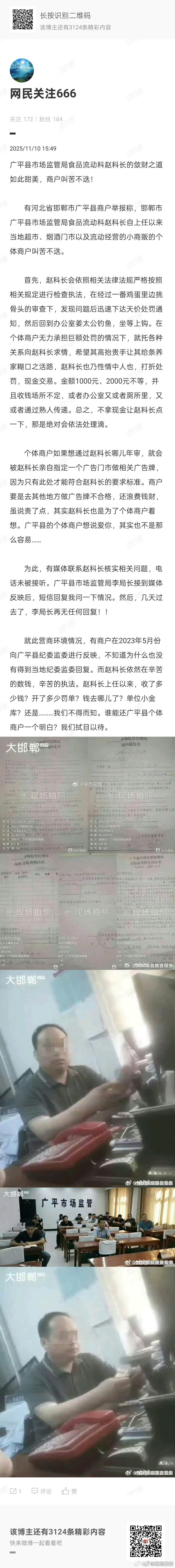 网友爆料 广平县市场监管局食品流动科赵科长的敛财之道如此甜美,商户叫苦不迭!