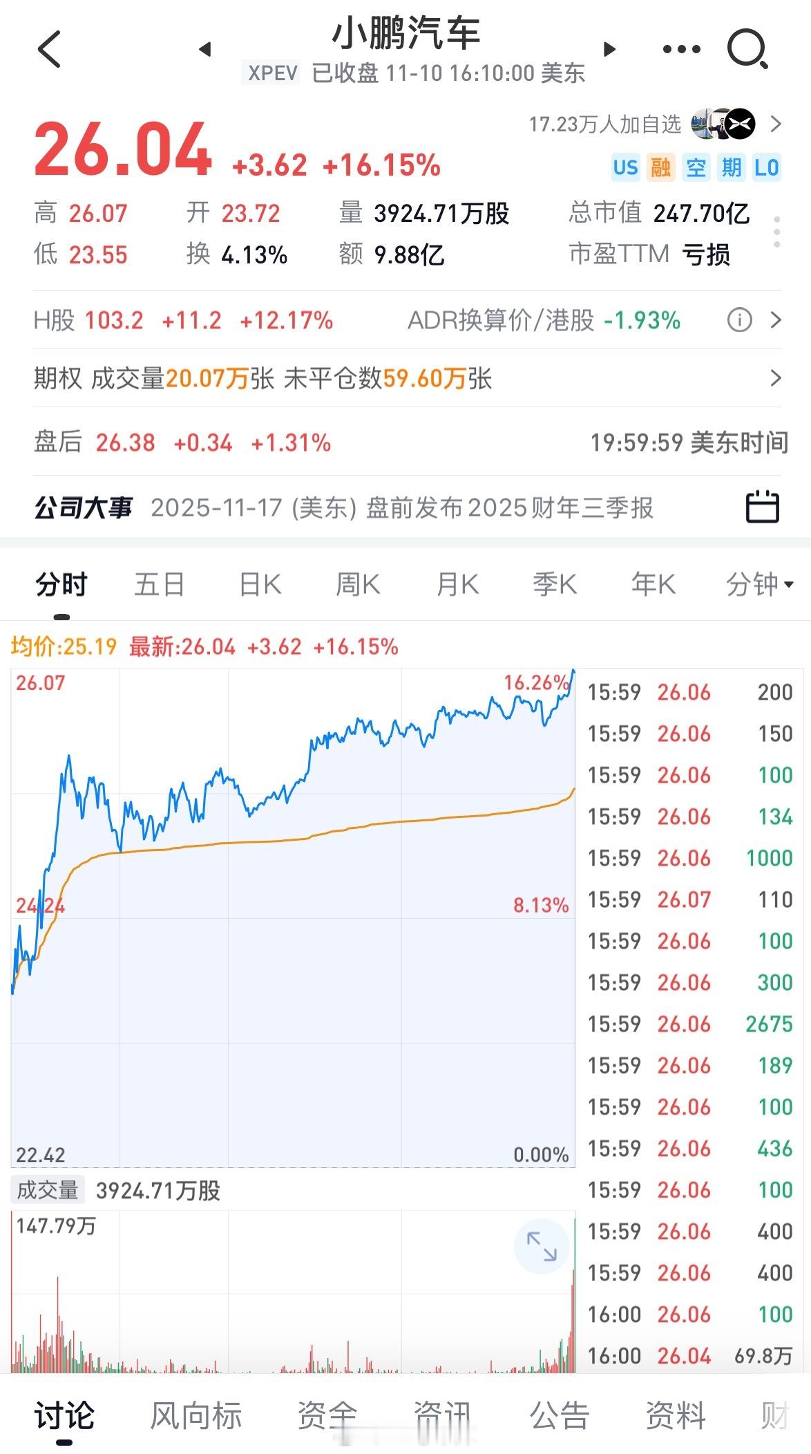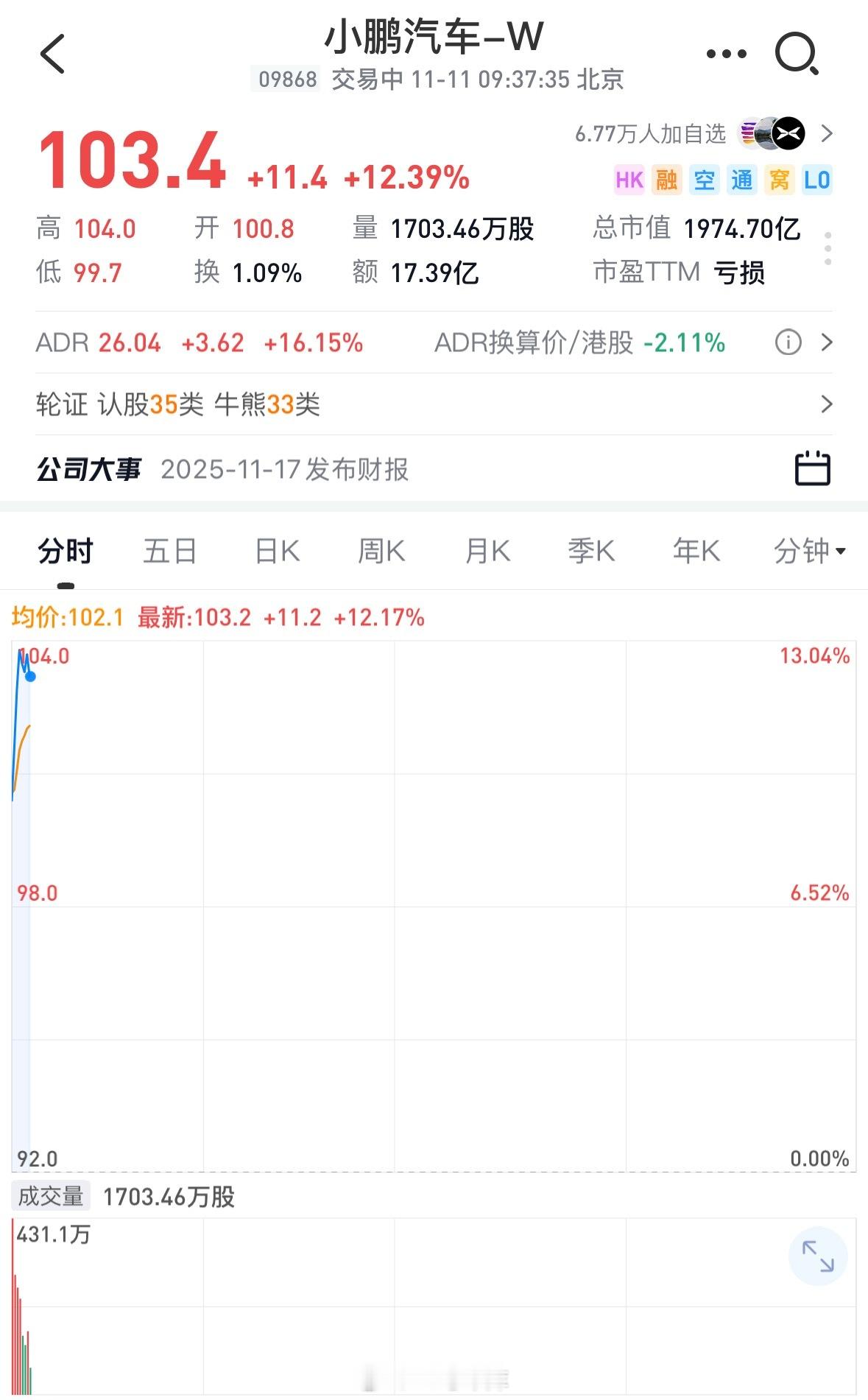 小鹏最近股价表现抢眼,昨晚美股大涨 16.15%,截至目前港股大涨 12.39%,市值来到 1974.7 亿港元[666]有没有拿住的朋友?