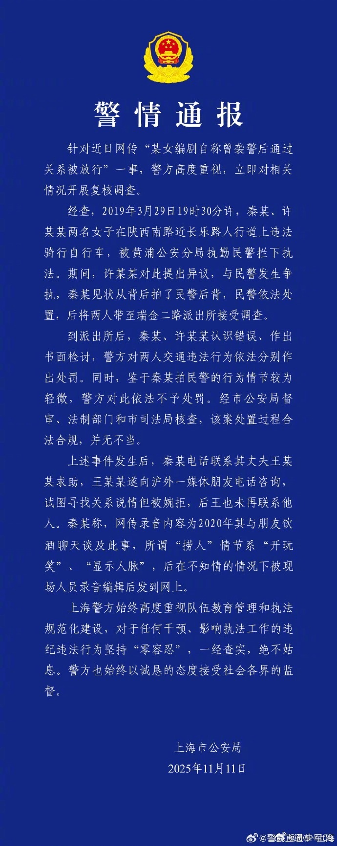 娱乐圈有点乱警方通报编剧秦雯自称袭警捞人