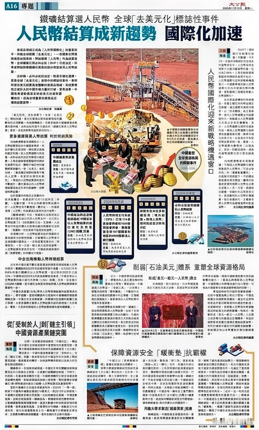 人民币结算成新趋势,国际化加速。据大公报,资源品领域正成为“人民币国际化”的重要抓手。伴随全球范围“去美元化”,一些国家在开展跨境原油贸易时,开始选择“人民币”作为结算货币。全球矿业巨头必和必拓(BHP)日前决定,四季度开始对华铁矿石贸易的部分现货采用人民币结算。 内地经济学家宋清辉表示,人民币结算更贴合中国买家需求,有助于优化交易流程、降低汇兑风险和锁定利润。从人民币国际化角度看,必和必拓的决定有极强示范效应。 宋清辉分析,人民币结算有助于俄罗斯企业规避西方针对性制裁,企业获得人民币后可直接采购中国商品,一定程度实现资金的“闭环使用”。另一方面,较之美元或其他货币,人民币结算有更高安全性,可彻底规避美国所谓“长臂管辖”和有关支付风险。