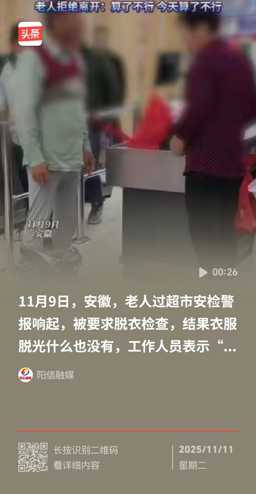 1月9日安徽超市,大爷过安检警报狂响。 当众脱外套、扒衬衫,只剩贴身衣物仍“嘀嘀”不停,活像被警报器黏上的“嫌疑犯”。 工作人员冷眼旁观,末了一句“可以走了”打发人。 原是设备故障误报,超市道歉赔偿和解。 网友炸锅不买账,这哪是自证清白,分明是尊严被按在地上摩擦,赔钱哪能抹平这委屈!安徽大爷 安徽探铜安检门