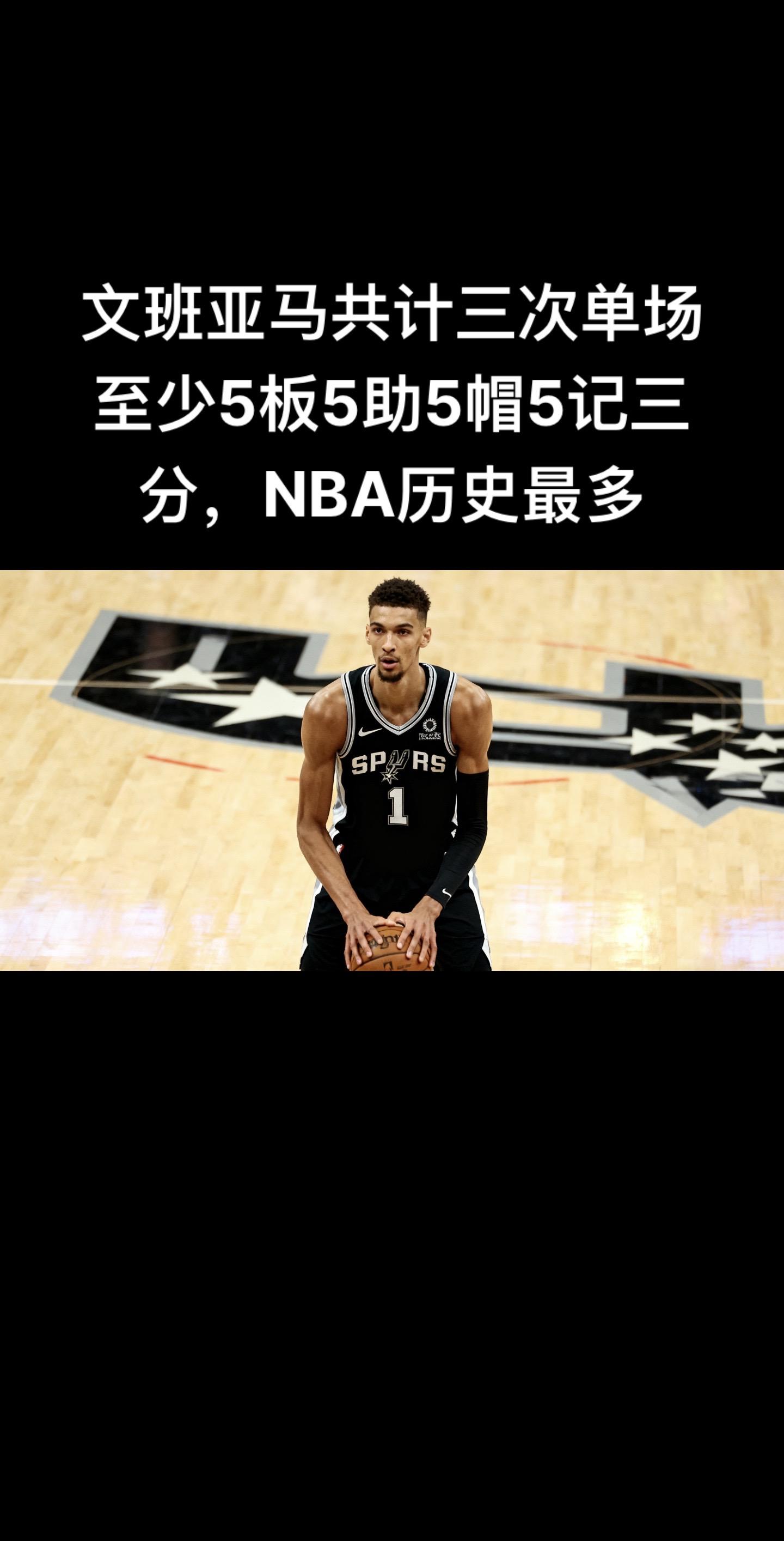 马刺121 - 117击败公牛的比赛后,文班亚马已三次达成单场至少5篮板、5助攻、5盖帽且命中5记三分的成就,该数据高居NBA历史第一。