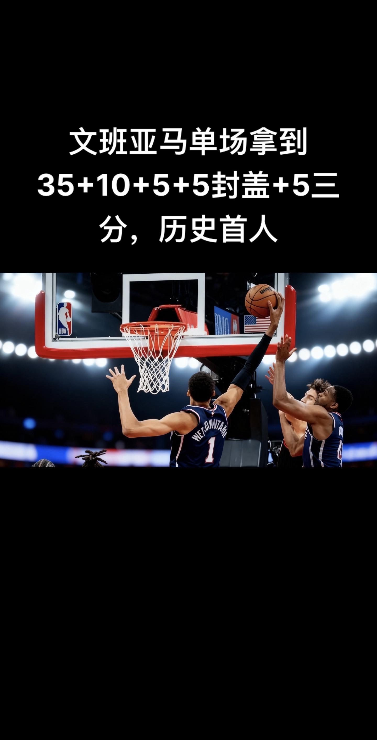 他仅出战36分钟,19投11中,其中三分球9投6中,罚球更是10投全中,最终砍下38分12篮板5助攻1抢断5盖帽。凭借这一数据,他成为NBA历史上首位单场拿下至少35分10篮板5助攻5盖帽,还能投进5+三分的球员。而且他在末节独揽18分,最后时刻更是连续命中关键三分,率队打出8 - 0攻势锁定胜局,妥妥的比赛胜负手。文班亚马篮球来nbamrd先生
