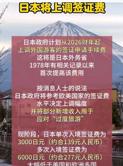 日本44年来首涨签证费! 单次飙至1300元, 多重税费叠加引游客不满 2025年11月11日,日本媒体曝重磅消息:政府计划2026财年起上调外国游客签证费,这是1978年有记录以来首次调整。现行单次签证139元、多次277元,此次涨幅达9倍,单次或涨至1300元,看齐欧美收费标准,新增收入号称用于应对“过度旅游”。 背后是日本旅游业的矛盾现状:2024年访日游客3687万人次、消费8.14万亿日元均创纪录,中国游客消费1.73万亿日元居首。但“过度旅游”致京都、镰仓等地交通拥堵、卫生恶化,当地居民不满加剧。 更让游客担忧的是“税费连环涨”:自民党拟将离境税从1000日元(约46元)提至3000日元(约139元),京都2026年3月起涨住宿税,高档酒店每晚最高缴1万日元。而日本未同步提升服务,却想学欧美“拒签不退费”,不少游客直言会转往东南亚免签或低价签证国家。