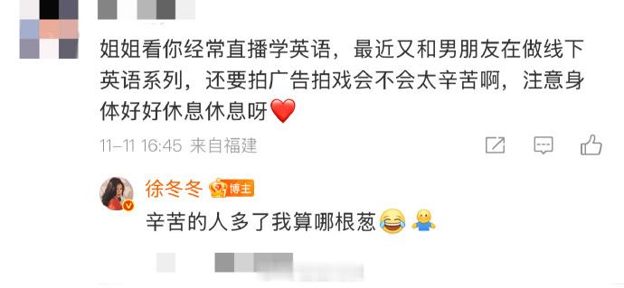 当粉丝心疼徐冬冬连轴转辛苦提醒休息,她一句 “辛苦的人多了我算哪根葱” 的自嘲太戳心了!没有卖惨没有矫情,直接暴露演员最真实的底色!从 “大嫂” 到现在,徐冬冬一直把自己放在演艺圈打工人的位置,用朴素价值观扎根,这份知轻重懂感恩的清醒,比励志语录珍贵!