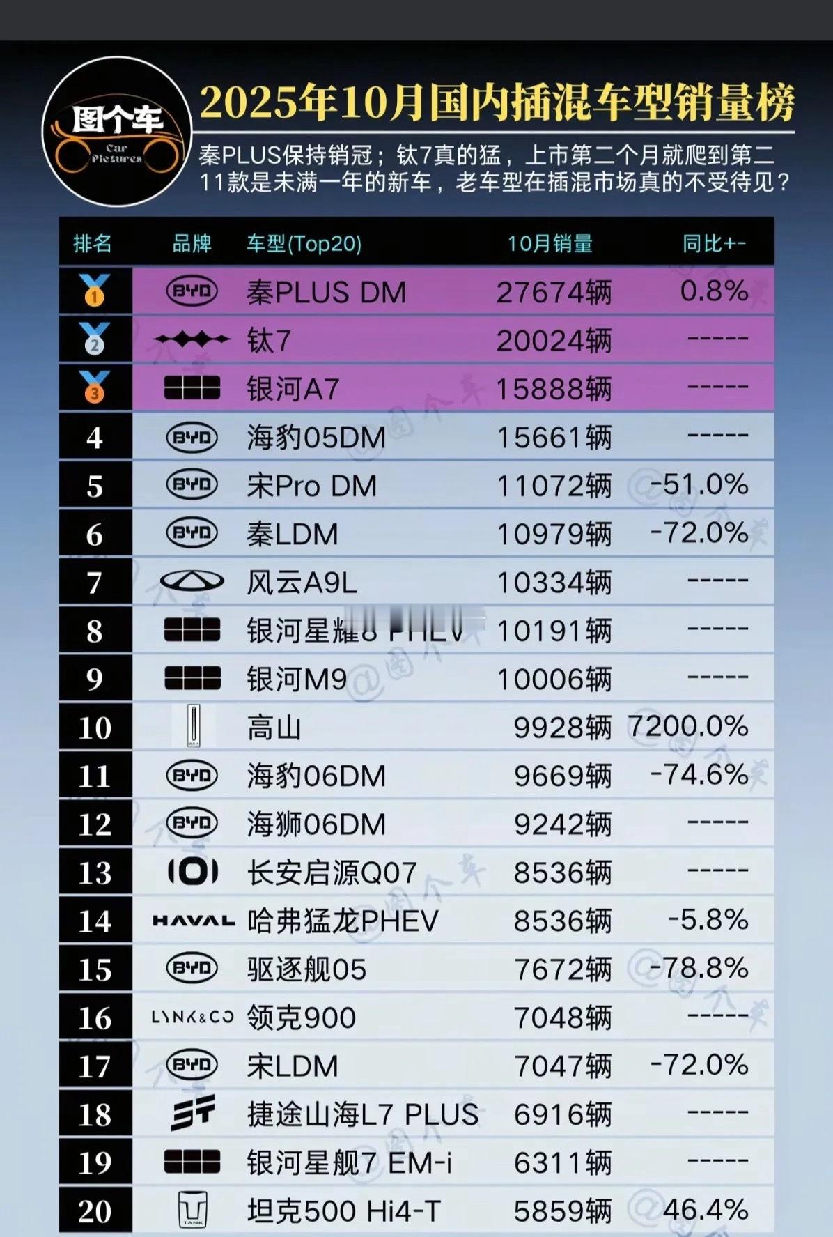 2025年10月:国内插混车型 销量榜秦PLUS保持销冠!钛7真的猛,上市第二个月就爬到第二11款是未满一年的新车,老车型在插混市场真的不受待见?宋Pro DM,秦LDM同比销量下降也太多了吧!
