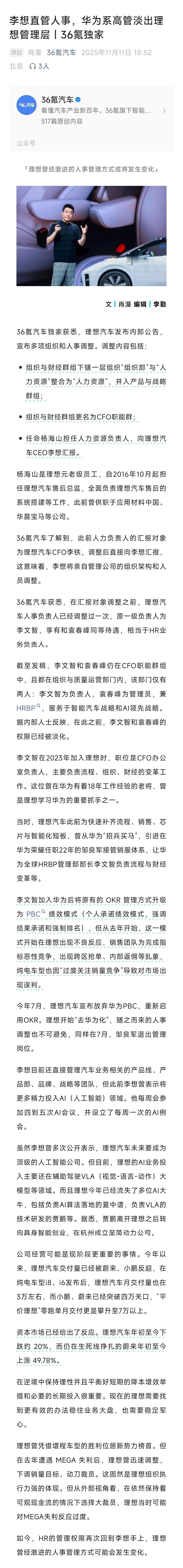 来自36氪的报道,理想调整了人力资源负责人36氪汽车独家获悉,理想汽车发布内部公