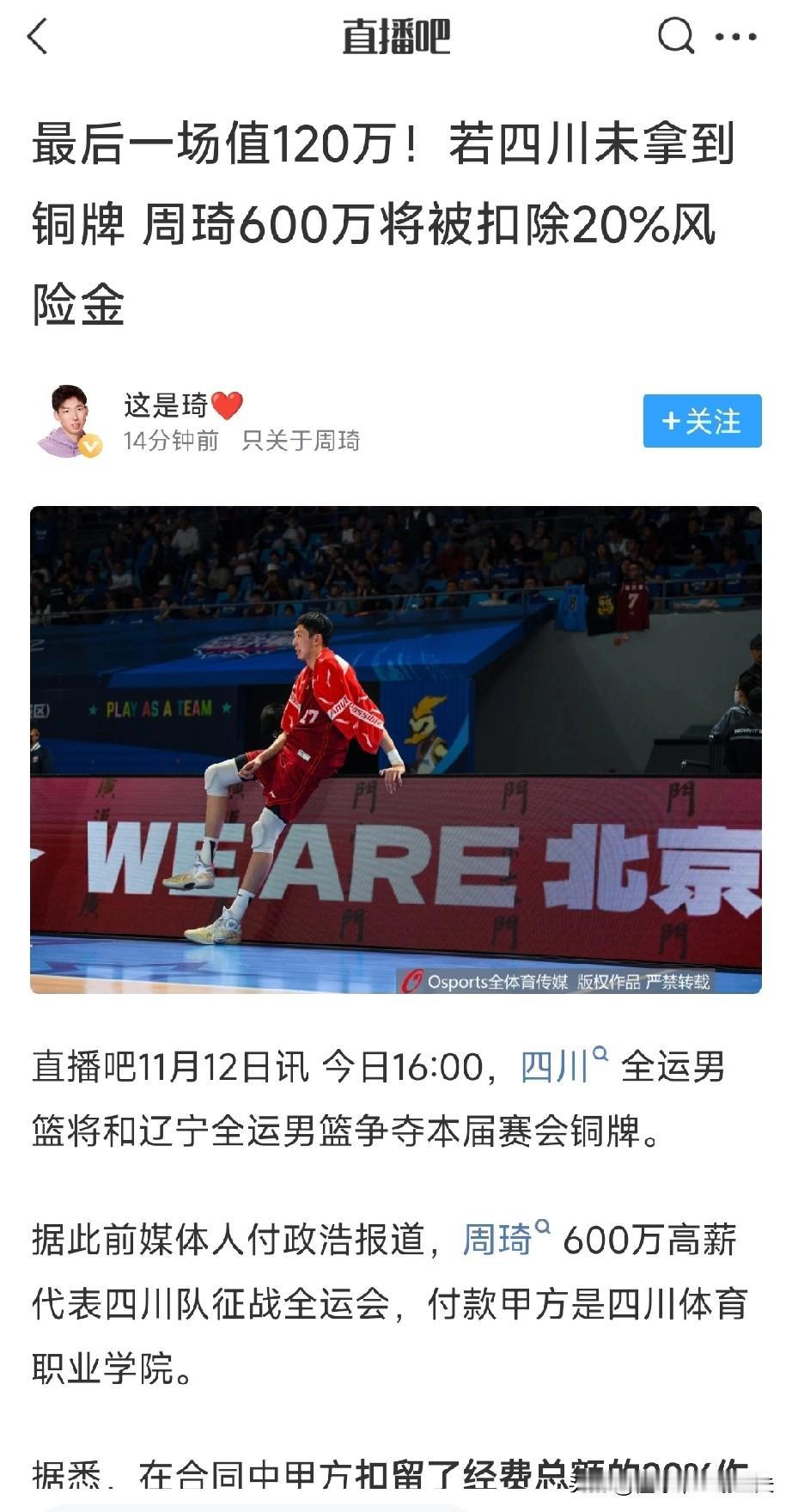 周琦铜牌战值120万!媒体人:没赚到600万,如果四川队没拿到奖牌,将扣除20%风险金;恕我直言,全运会才打几场比赛,就赚到600万,相当于CBA一个赛季的合同金额,难怪周琦拼命加盟四川出战全运会呢,既然周琦值600万,可以大胆推测孙铭徽+胡金的薪金不比周琦少,起码持平,三巨头的工资高达1800万,这里还不包括广厦班底报价+四川球员薪水+王博报酬,打全运会,四川队至少拿出3-5千万,换一块铜牌不值得!