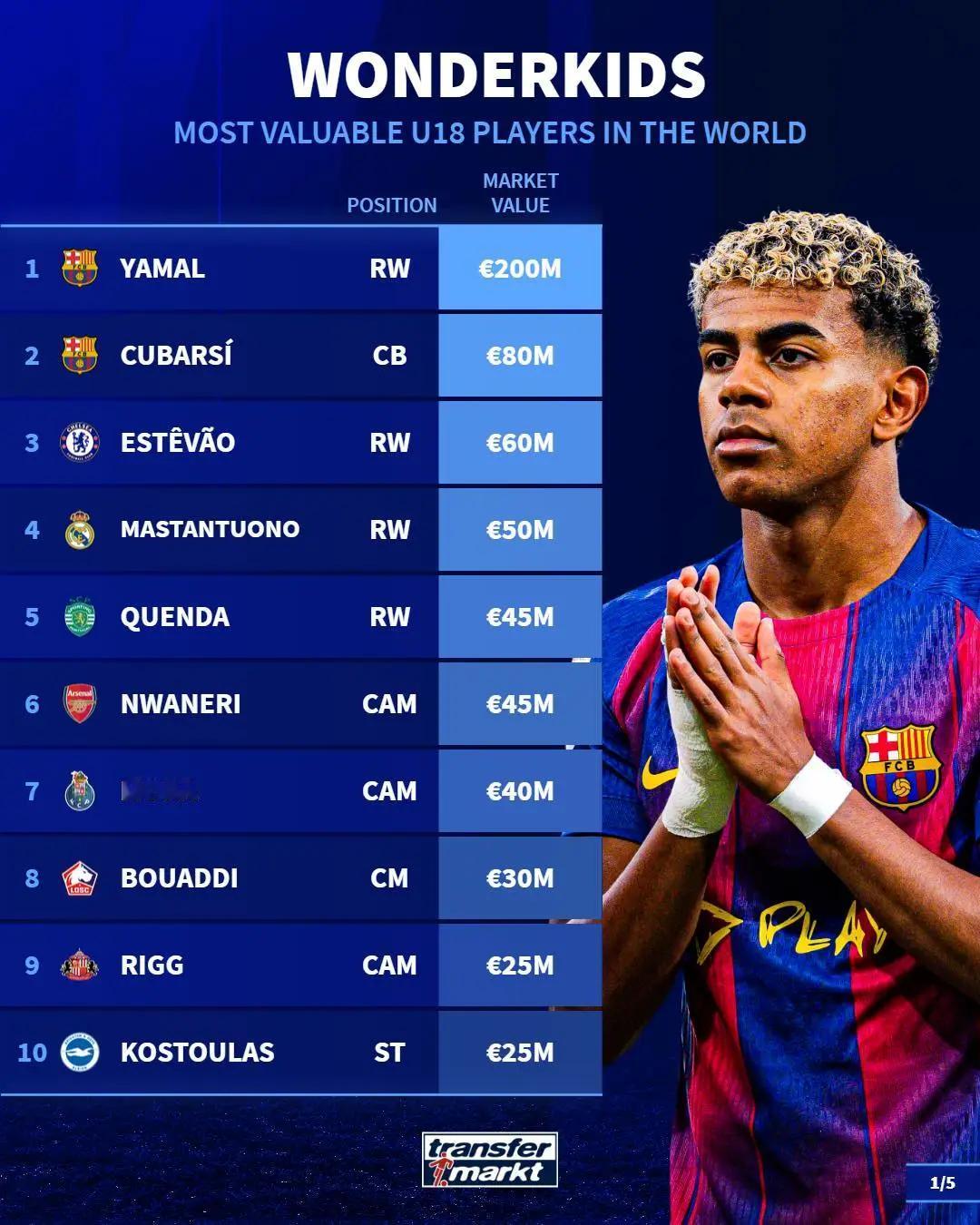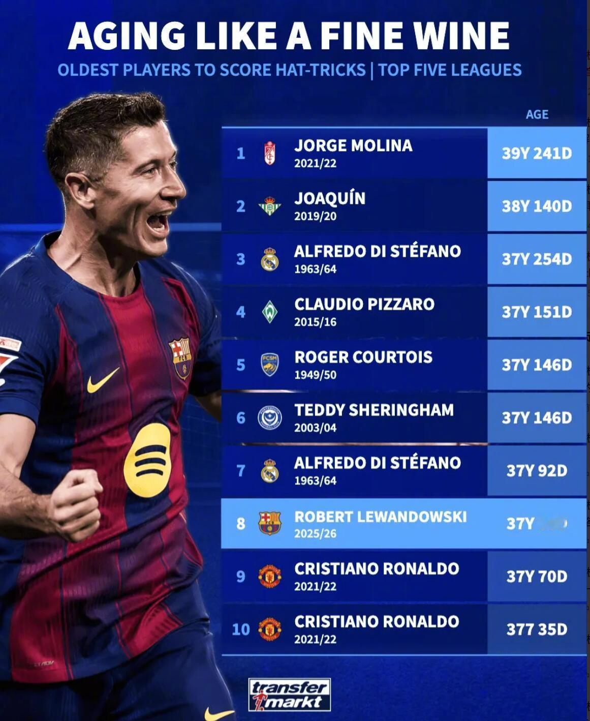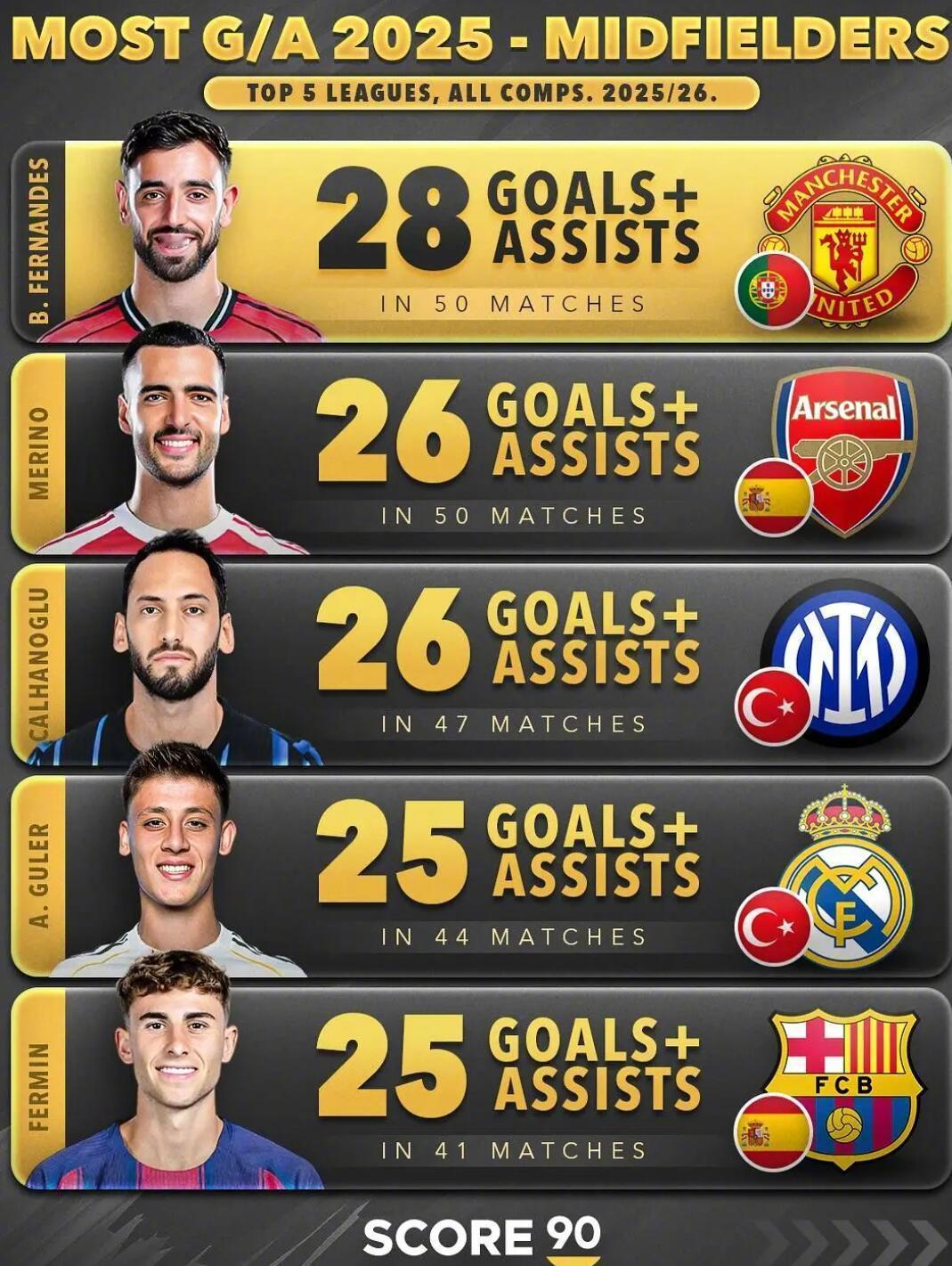 绿茵资讯! ★2025年度各项赛事(俱乐部+国家队)参与进球最多的五大联赛前锋和中场球员。 前锋中姆巴佩最多,而中场球员则是曼联的B费最多。 ★五大联赛史上最年长的帽子戏法制造者! 莱万上一轮西甲的帽子戏法排名第八。 ★莱万的巴萨进球数达到107球,超过了内马尔的105球。 ★18岁以下球员德转身价! 亚马尔以2亿欧元遥遥领先。 ★五大联赛以外身价最高的欧洲球队! 葡超三强波尔图、波尔图和本菲卡包揽前三。 ★利物浦夏窗投入3.65亿欧元引进3名新攻击手——伊萨克、维尔茨和埃基蒂克,仨人一共进了7个球。 而迪亚斯卖给拜仁7000万欧元,现在自己一个人已打入11球。 ★好尴尬! 斯洛特2025年输掉的比赛场次比阿莫林还要多一场。 ★11轮英超后利物浦仅拿到18个积分,创下了英超史上卫冕冠军在前11轮中第4低的积分纪录。