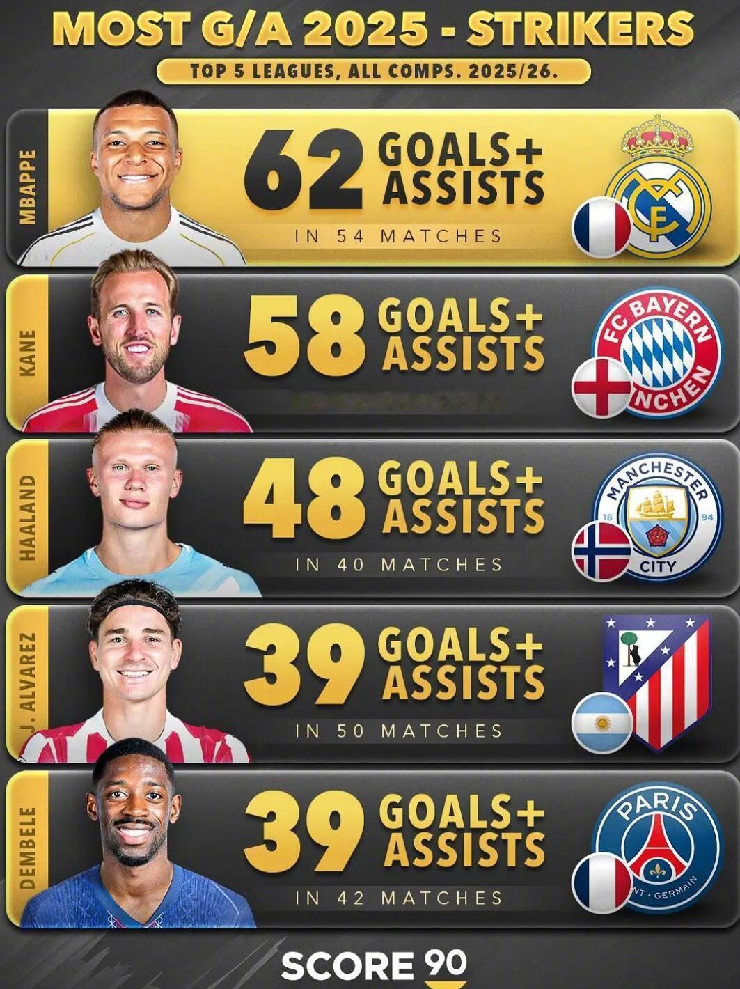 绿茵资讯! ★2025年度各项赛事(俱乐部+国家队)参与进球最多的五大联赛前锋和
