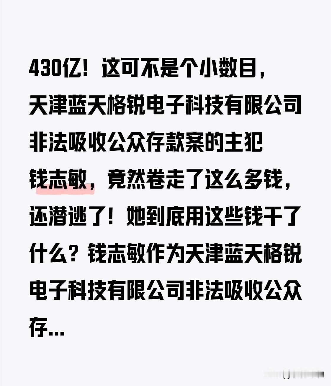 430亿!这可不是个小数目,天津蓝天格锐电子科技有限公司非法吸收公众存款案的主犯钱志敏,竟然卷走了这么多钱,还潜逃了!她到底用这些钱干了什么? 钱志敏作为天津蓝天格锐电子科技有限公司非法吸收公众存款案的在逃主犯,涉案资金高达430亿人民币,这简直是个天文数字。她潜逃后,并没有选择低调生活,而是用这些涉案资金疯狂购买了大量资产,包括房产、豪车、珠宝等奢侈品,甚至还在海外购置了多处房产。这些行为不仅严重损害了投资者的利益,也扰乱了金融市场的秩序。警方一直在全力追捕钱志敏,希望能够尽快将她绳之以法,追回涉案资金,为投资者挽回损失。然而,钱志敏却像人间蒸发了一样,消失得无影无踪。她的行踪成谜,警方也一直在努力寻找她的下落。这场跨国追捕行动,无疑是一场艰难的较量,但警方表示,他们绝不会放弃,一定会将钱志敏缉拿归案。 钱志敏的潜逃和疯狂消费,无疑是对法律和道德的严重挑衅。我们期待警方能够早日破案,将钱志敏绳之以法。大家对于这起案件有什么看法呢?快来评论区留言讨论吧! 钱志敏诈骗案 钱志敏 犯罪资金