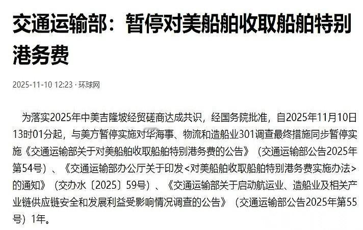 想卡我们脖子,结果差点把自己憋死。 这事儿真挺有意思的。 之前老美那边,说要查我们海运啊、造船啊什么的,摆明了就是想找茬,想在我们最关键的产业链上动刀子。 我们呢?也没惯着。反手就给他们挂靠的船加了一笔“特别服务费”。 说白了就是:来我的地盘,就得守我的规矩,想使坏?先交钱。 就这么一招,直接打到了七寸上。 现在好了,他们那边先扛不住了,说那个调查先不搞最终措施了。 我们这边也大气,行,那你的“特别服务费”也给你暂停一年。 你看,这你来我往的,谁先眨眼了,谁心里疼了,不是一目了然吗? 说到底,为啥? 因为这世界离了谁都能转,但想绕开中国的产业链,特别是海运物流链,你试试? 全球一半以上的船是我们造的,世界前十的港口我们占了七八个。你那些船公司,天天被我们收着“罚单”,成本蹭蹭往上涨,回去能不找他们政府哭爹喊娘吗? 所以啊,别总想着搞那些虚头巴脑的小动作。 在绝对的实力面前,任何花里胡哨的招数,最后都会变成一个笑话。 当然,这次只暂停一年。 意思也很明白:给你个台阶下,也给你个反省期。 想好好做生意,我们欢迎。 还想玩,我们的工具箱里,家伙事儿多着呢。
