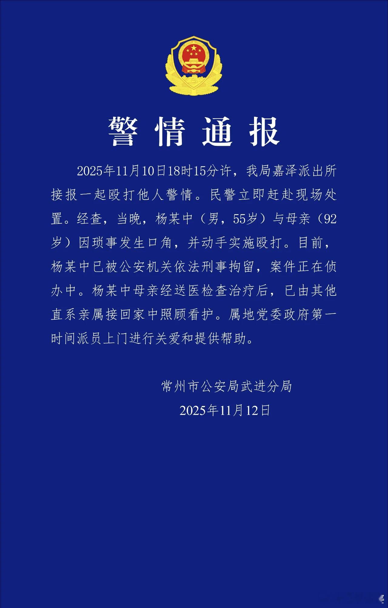 常州武进警方通报儿子殴打90余岁母亲案件:犯罪嫌疑人被依法刑事拘留。(来源:常州市公安局武进分局)