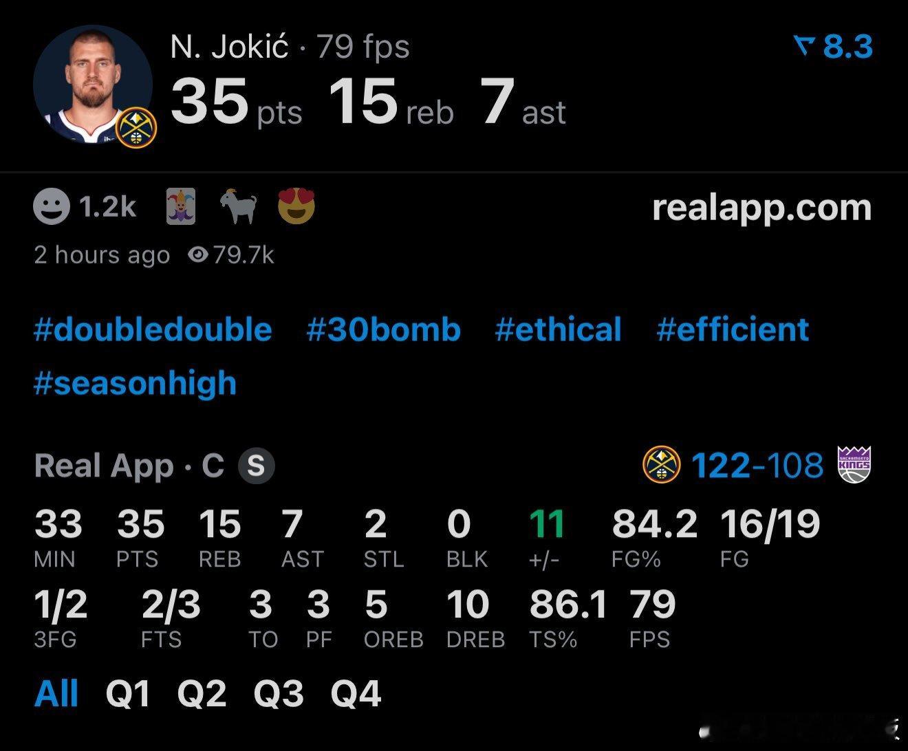 恐怖效率!约基奇本场轰下35分15板7助2断,投篮19中16。掘金取得5连胜,明日背靠背对阵快船这是约基奇生涯第26次单场至少35分15板5助攻,超过字母哥(25次),近50年来NBA最多