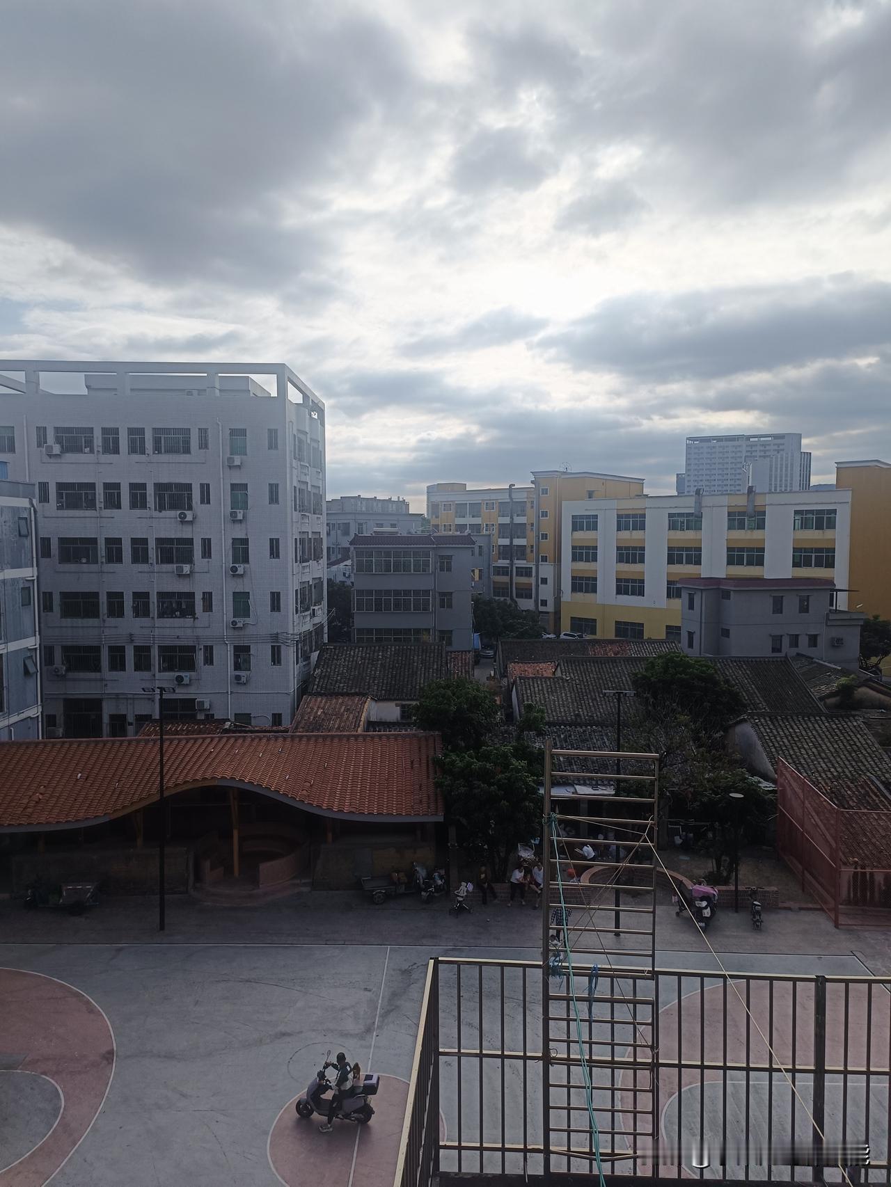 看这天上的云,一会儿聚一会儿散,就像生活里的事儿,有晴有阴。老房子和新楼房挨在一块儿,就跟咱们的日子似的,得学着和过去现在和解。篮球场上有人骑电动车穿梭,就像人生总有意外插曲,但咱该往前还是得往前。别纠结太多,该乐呵乐呵,该扛着就扛着,日子嘛,就这么一天天过,活个踏实自在。