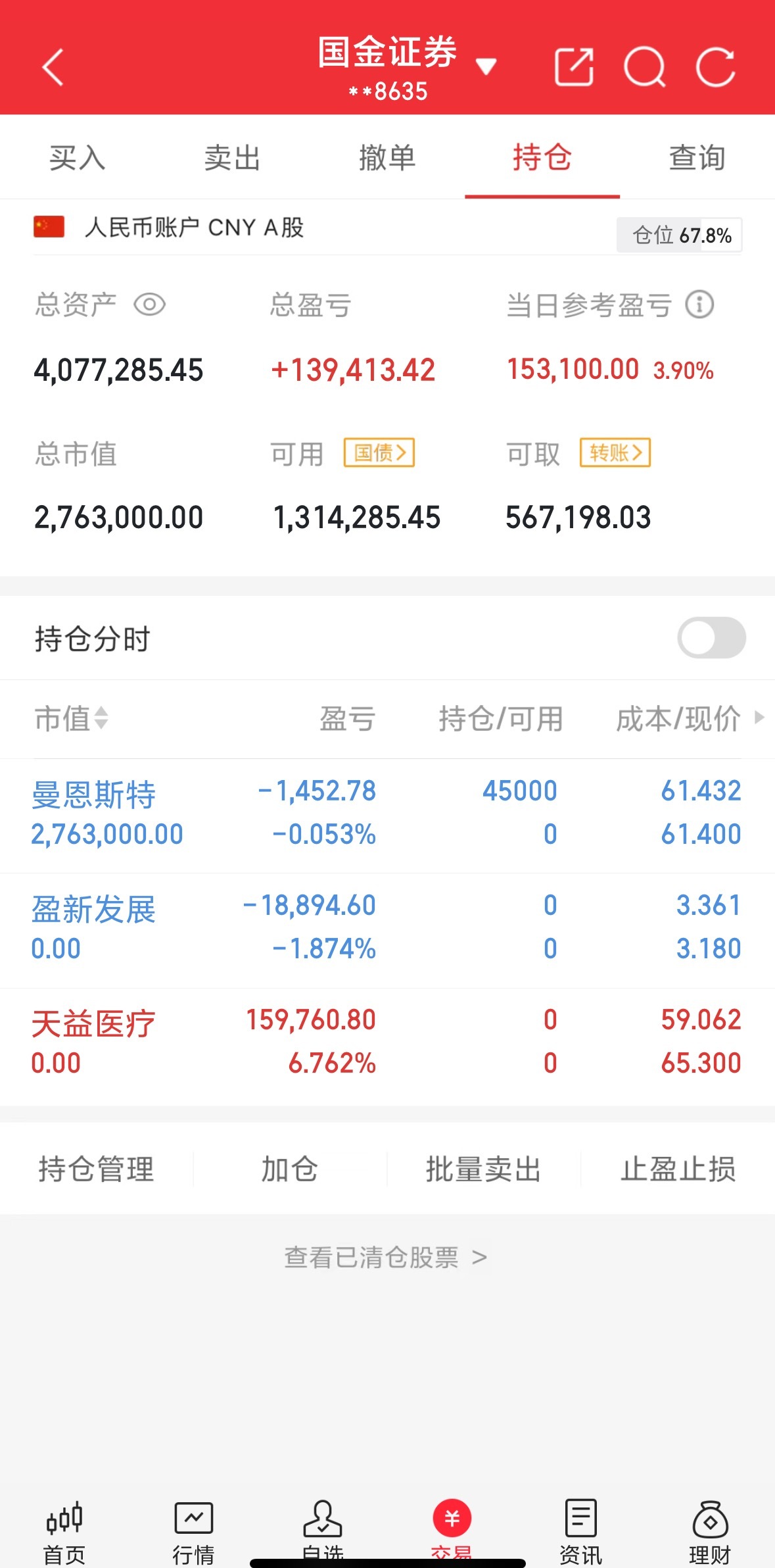 200w本金,目标1年做到1000w,1年翻五倍,欢迎各位关注验证!(第89天)今天买入:曼思今天卖出:天益、盈新继续持有:看明天继续突破感谢大家的支持与互动,点赞富一生,评论666股市一路长虹特别声明:这只是我个人的操作记录,不作为任何投资建议,更不是劝你们跟买! 股市有风险,投资需谨慎!