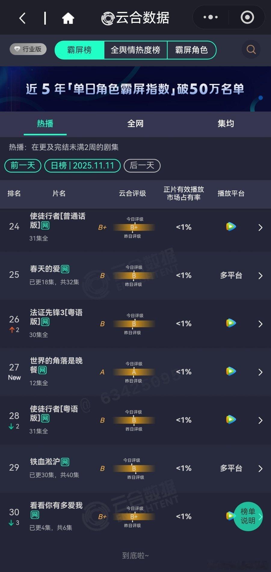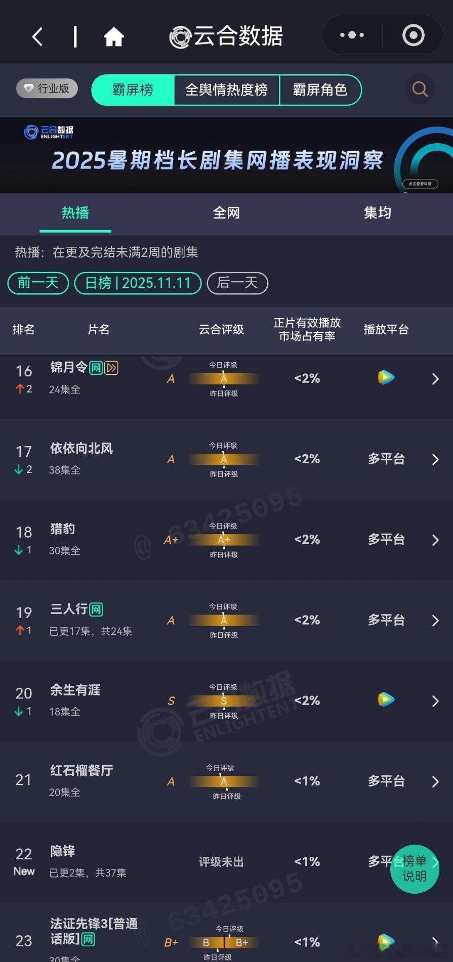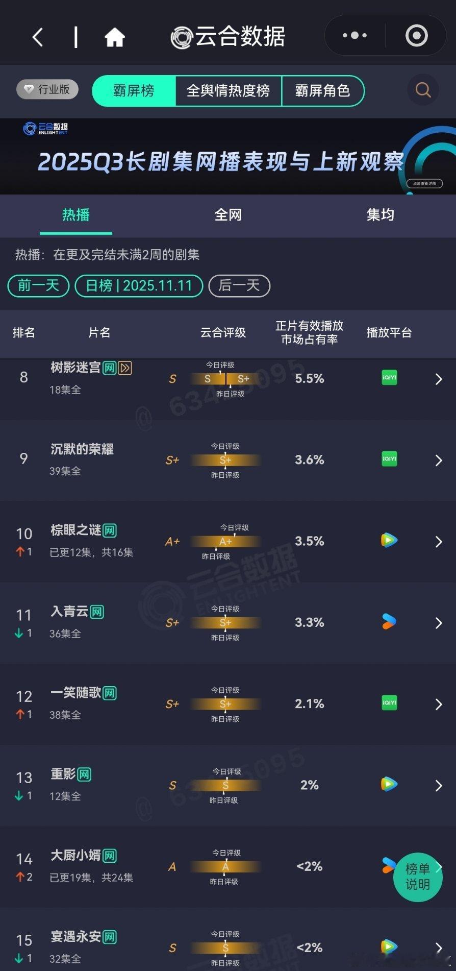 11月11日云合播放占比 唐朝诡事录之长安22.9%横盘了,随着下面几部剧的逐渐完结,唐诡3很有可能又是一部占比很高,但是最终集均播放量只有四千多的剧,因为大盘不涨。四喜9.2%评级S。这剧也算是越播越好了。很少看到云合第一页一水的S评级,长剧真是💊💊了。