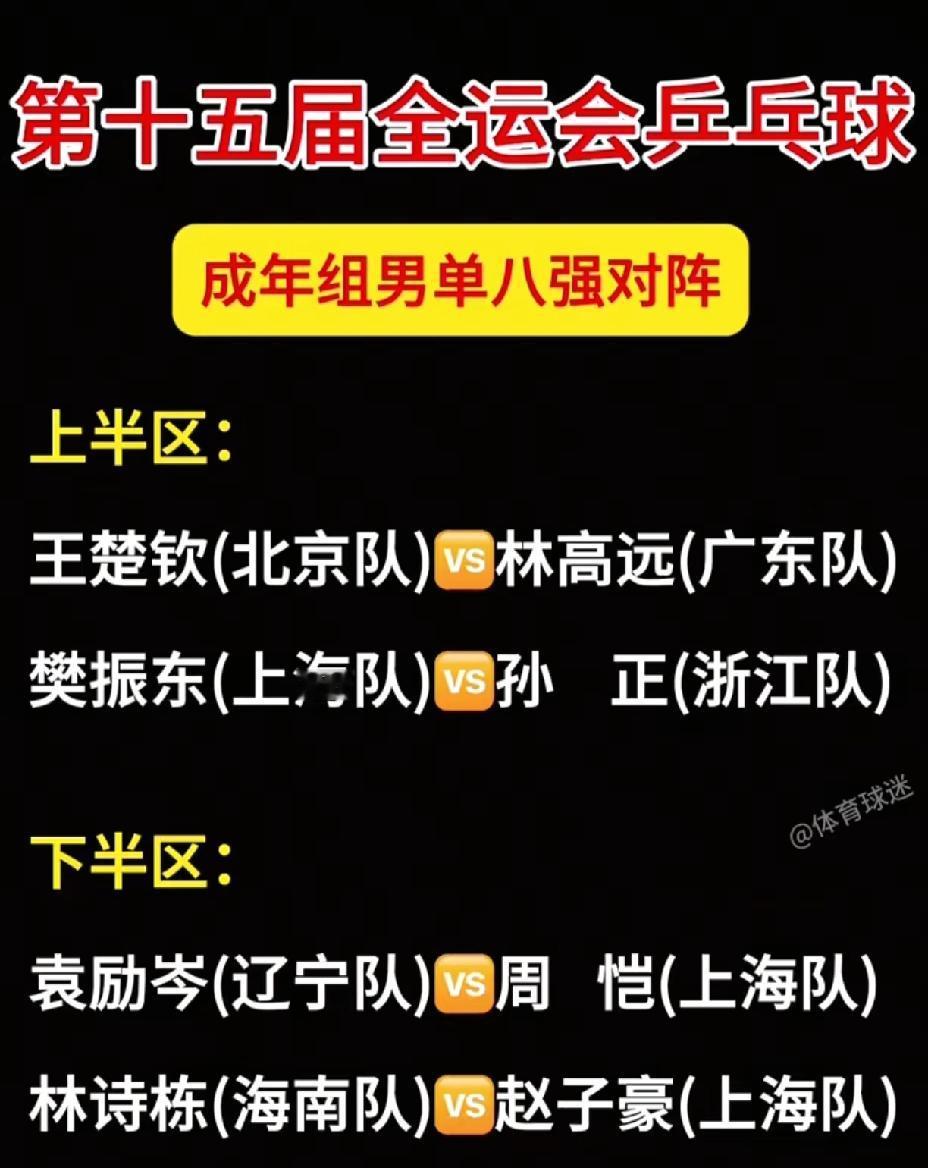 全运会单打八强出炉, 女单八强在意料之中, 男单八强却在意料之外。 乒乓球单打八强诞生, 女单八强还是意料之中的, 基本是世界排名前几的运动员, 只有一个陌生的名字刘斐。 这次女单八强, 辽宁队占据三个席位, 分别是陈幸同、王艺迪、刘斐。 男单八强就有点意料之外了, 除了我们熟悉的王楚钦、林诗栋、 樊振东、林高远, 还有几位不参加国际赛事的省队队员, 看来全运会确实是卧虎藏龙。 这次男单八强上海占据了三个席位, 分别是樊振东、周凯、赵子豪, 这次上海队确实挺厉害。 接下来的1/4决赛中, 最有看点的就是, 新生代的蒯曼对战老将陈梦, 王曼昱对战刚刚获得蒙彼利埃冠军的王艺迪。 让我们拭目以待, 最终单打四强会是怎么样的阵势。 (图片源自于水印) 带定位晒今日生活 我的今日状态:😁轻松愉快 我这里的天气:☀️晴天