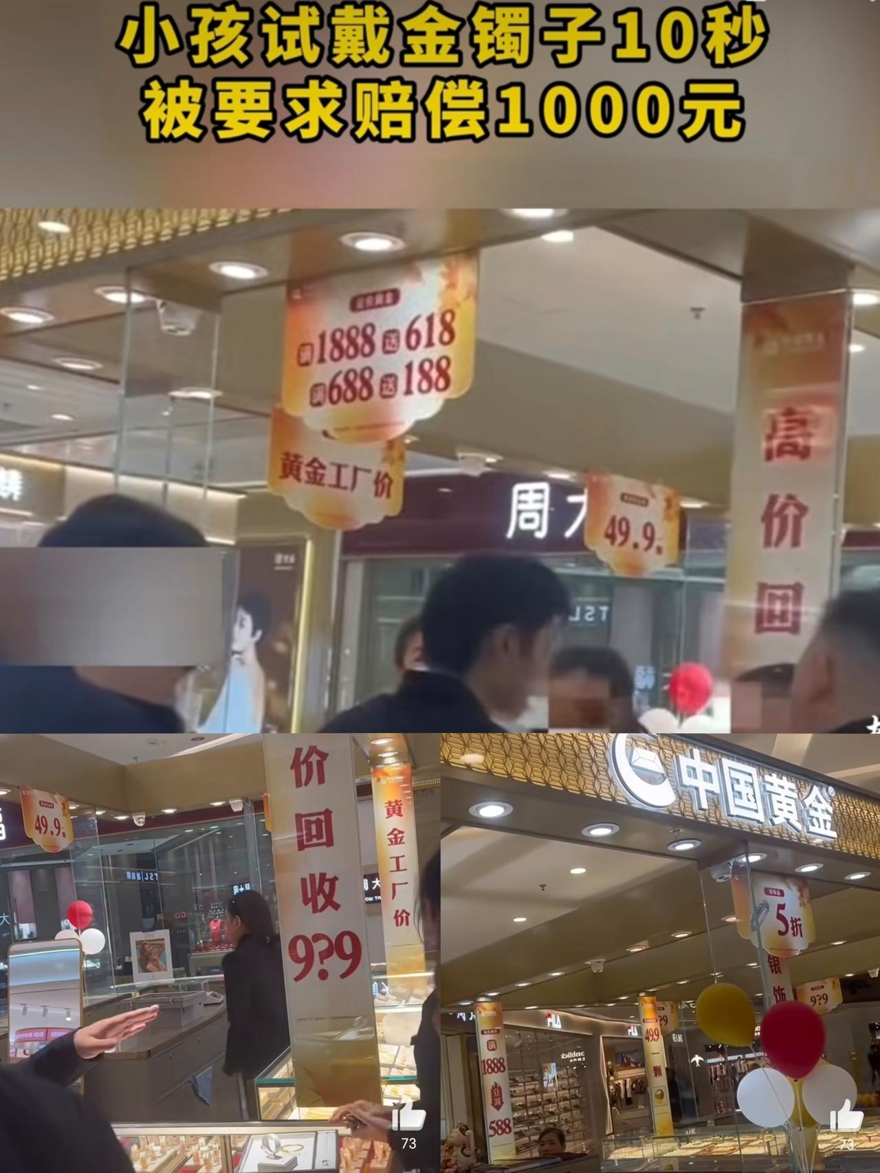 金店生意多难 今天你们就见识到了 一位妈妈带着孩子逛金店,随手试戴了个金手镯,前后不到10秒钟。取下来时营业员突然变脸,硬说手镯变形了,非要赔1000元才放人走。 当事人委屈得不行:那镯子大得直晃荡,连孩子手腕都没挨着,怎么就弄坏了?连到场的民警都觉得这也太可笑了! 某些金店真该好好管管了。全程盯着顾客试戴,转头就说弄坏了要赔钱。不让试戴,摆那干嘛?要是金器真这么娇气,戴十秒就能变形,那买回家还不得供起来? 大家都看得出来,这不就是变着法子坑人嘛!专挑带孩子的妈妈下手,不就是看准了她们不想惹事、容易妥协。要不是民警来得及时,这位妈妈怕是要被硬宰一笔。
