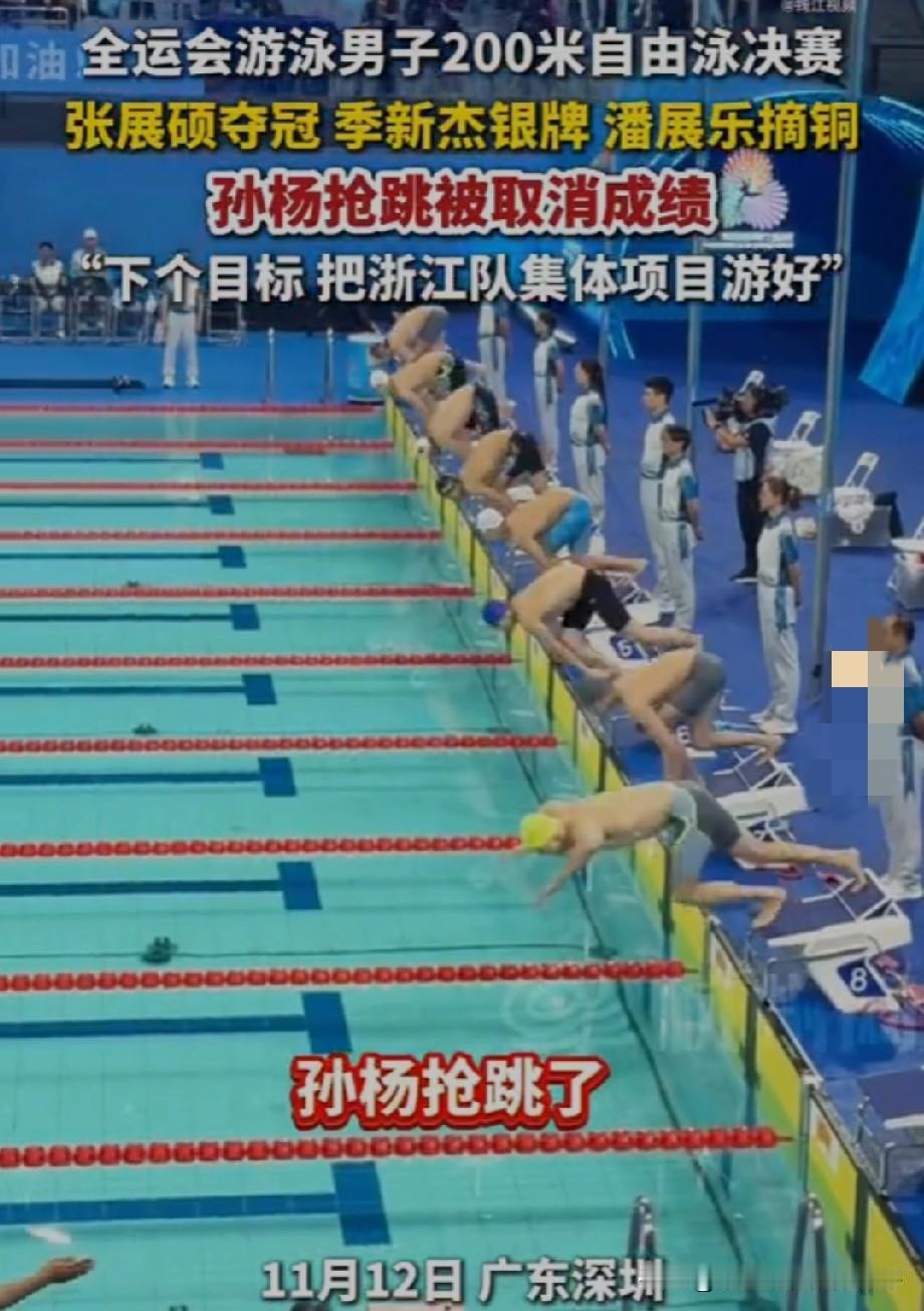 孙杨因犯规被取消成绩 潘展获乐铜牌 11月12日,广东,深圳,全运会游泳男子200米自由泳决赛,张展硕1分44秒86夺冠,创造全国青年纪录、季新杰1分45秒96获得银牌,潘展乐1分46秒37获得铜牌。