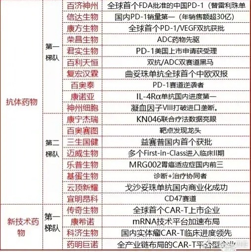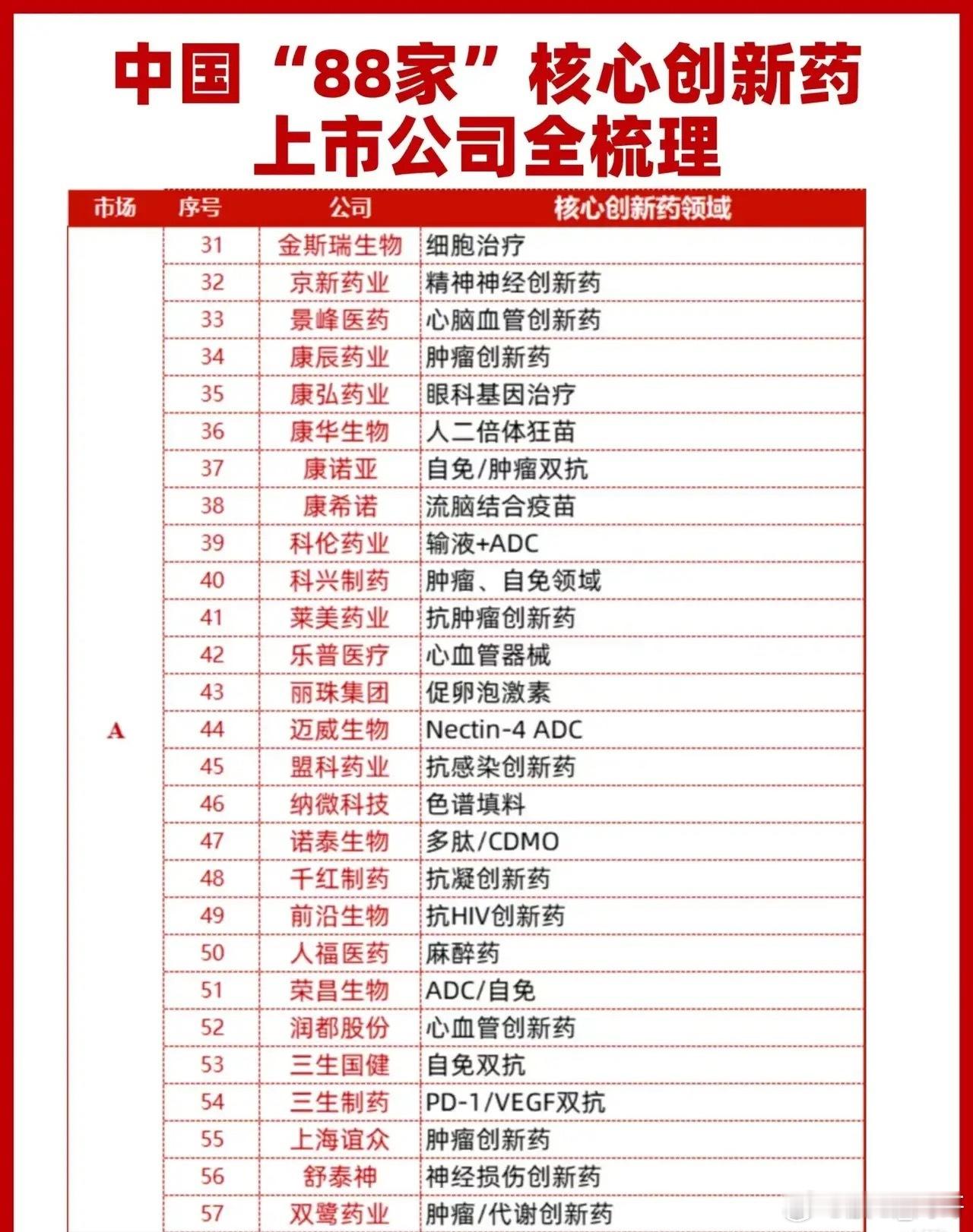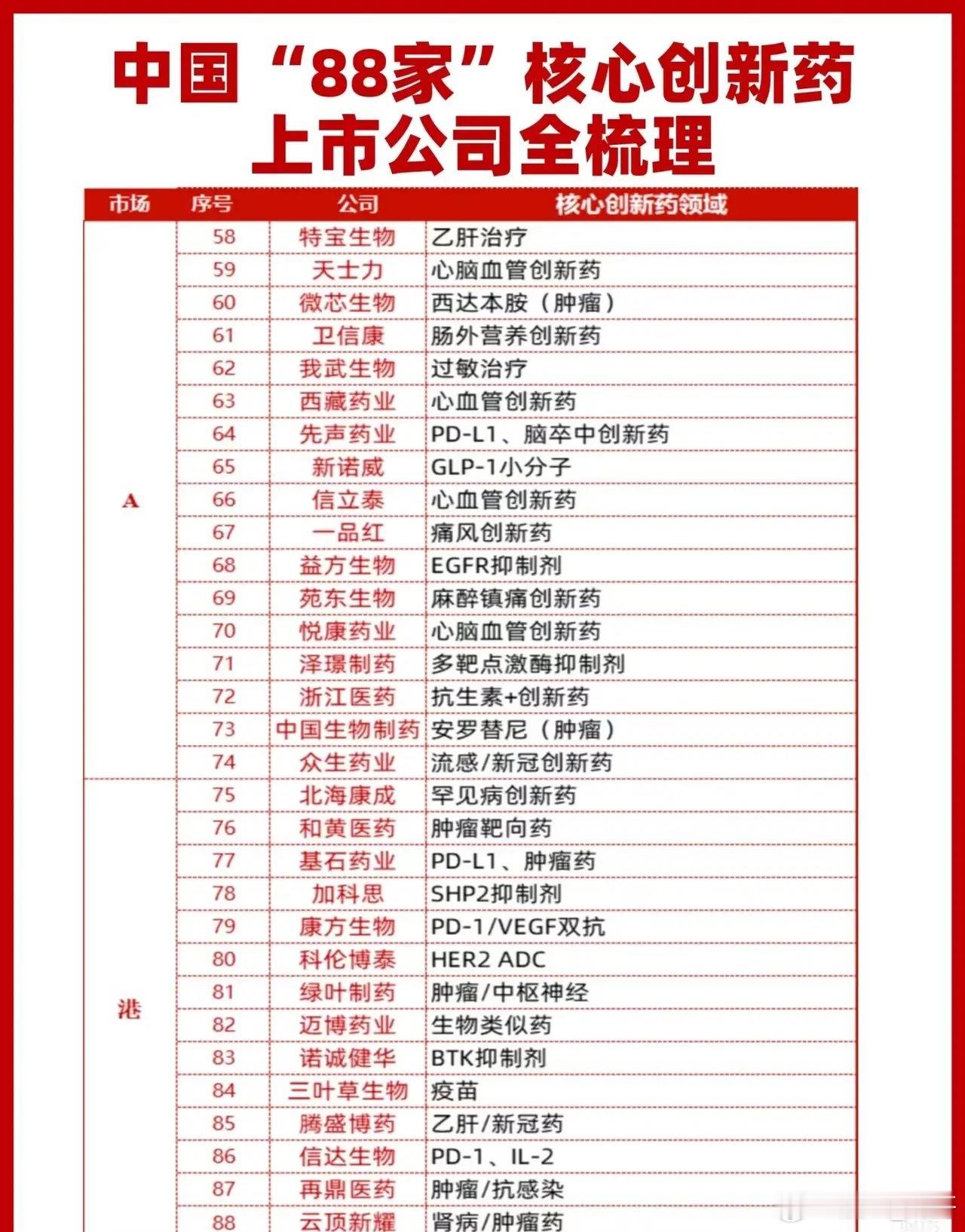 中国创新药核心龙头88强名单出炉!创新药是具有全新化学结构、新靶点或新治疗机制的药物,中国88家核心创新药上市公司全梳理!从细胞治疗、肿瘤新药到疫苗、ADC等前沿领域,既有A股药企深耕细分领域,也有港股公司布局全球创新。都是行业细分领域龙头代表值得关注!中国生物医药创新实力企业梯队划分!第一梯队:恒瑞医药、百济神州等,覆盖肿瘤、自免、ADC等热门赛道;第二梯队:前沿生物、乐普生物等等也在细分领域冲刺突破。(具体龙头名单见配图,资料取材网络仅供参考)这些企业从靶点创新到商业化布局,撑起了中国创新药的“硬实力”版图。