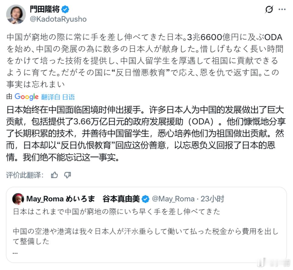 一旦中日关系出现波澜,日本政客、媒体和某些精日就是这套说辞!谈日本对华援助,不谈中国政府当初认为日本人民也是日本军国主义的受害者展现“大国风度”放弃了战争赔偿,不谈当初日本产品因此占据大量中国市场、不谈日本侵华给中国人带来的巨大苦难并且至今不思悔改;谈美国让中国加入世贸组织,不谈当时140多个世贸组织成员都允许中国加入,不谈美国是世贸谈判对中国设置条件最苛刻谈判最艰难的一个;谈中美曾经是二战盟友,美国曾经帮助中国打败日本侵略者,中国应该感恩,不谈日本偷袭珍珠港之前,美国一直源源不断的向日本战争机器提供支持并大发战争财,不谈现在是美国主动把中国当敌人对中国发起了科技战贸易战公开要围堵遏制中国!这套说辞,就仿佛日本企业和美国企业千里迢迢来中国不是为了赚钱就是为了给中国送温暖似得!就如同说当初的日军荷枪实弹来到中国不是为了侵略是为了打造“大东亚共荣圈”似得;就如同说现在的美军全副武装闯进别人家里不是为了掠夺是为了送“民主自由”一样!总有人把中国的发展强大视为别人的恩赐,我就纳了闷了:跟美国和西方关系好的国家多了去了,怎么就中国发展成了世界第二大经济体?这个世界号称民主自由的国家有100多个,怎么就中国发展成了世界第二大经济体?印度号称世界最大的民主国家,跟美国日本以及当初的苏联现在的俄罗斯的关系不知道好到哪里去了,怎么就中国发展成了世界第二大经济体?!怎么偏偏别人就这么喜欢恩赐中国?!恩赐?只有狗才会把自己的一切都视为主人的恩赐。再说了,我们买美国日本企业的产品不花钱吗?中国发展成为世界第二大经济体不是靠中国人从过去生产衣服鞋袜到现在生产手机大飞机一点一滴辛苦劳动生产出来的吗?!有些人,动辄让中国人感恩这个感恩那个,你们吃着中国人民生产的粮食用着中国人民生产的东西,说着中国话流着中国血生长在中国的土地上,我也没见你对中国有多感恩!我还要提醒有些人一点:还有些人指责我们反美仇日,你搞清楚,是美国和日本把中国当敌人公开要围堵遏制中国,不是中国!是美国和日本公开支持港台毒分裂,不是中国!是美国对中国发起科技战贸易战,不是中国!是日本至今不思悔改依然甘当美国围堵中国的马前卒和炮灰,不是中国!美国人反中,中国人就反美;日本人仇中,中国人就仇日。你们不要倒果为因!相比高达九成的日本人反华,中国人反日能不能到九成还不一定呢!更何况日本人压根没资格反中,中国更有理由反日,因为日本鬼子手上还欠着中国人的血债没还呢!